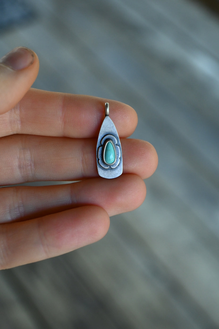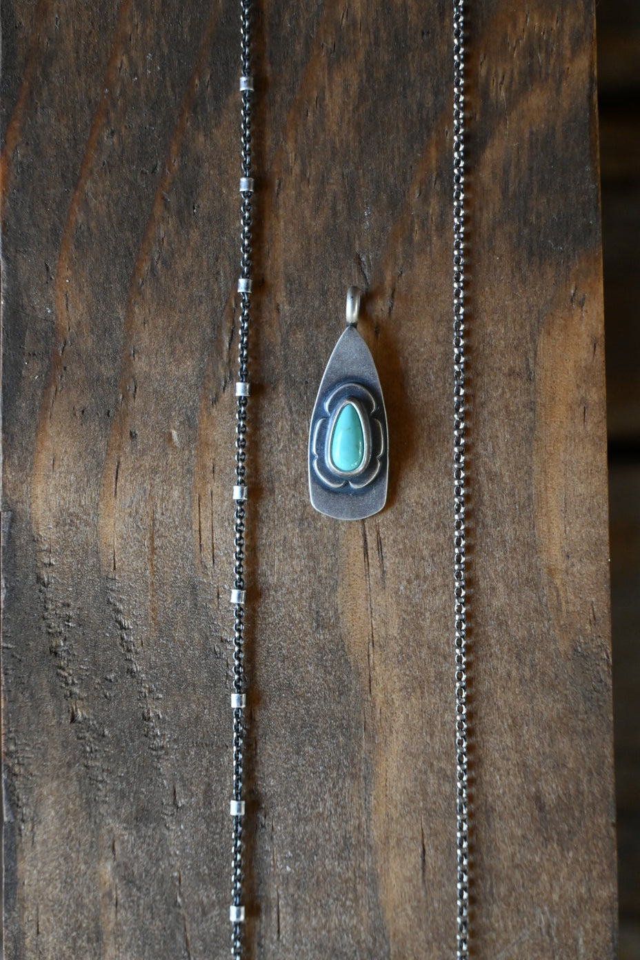 This necklace features a Lone Creek Turquoise stone on a sterling silver double layered, hand sawn + accented backing. Dipped in patina and buffed for a matte finish.