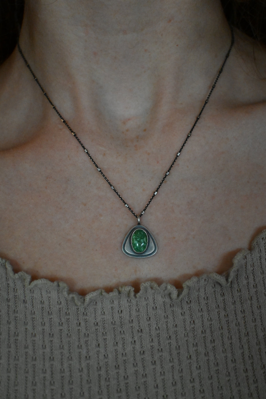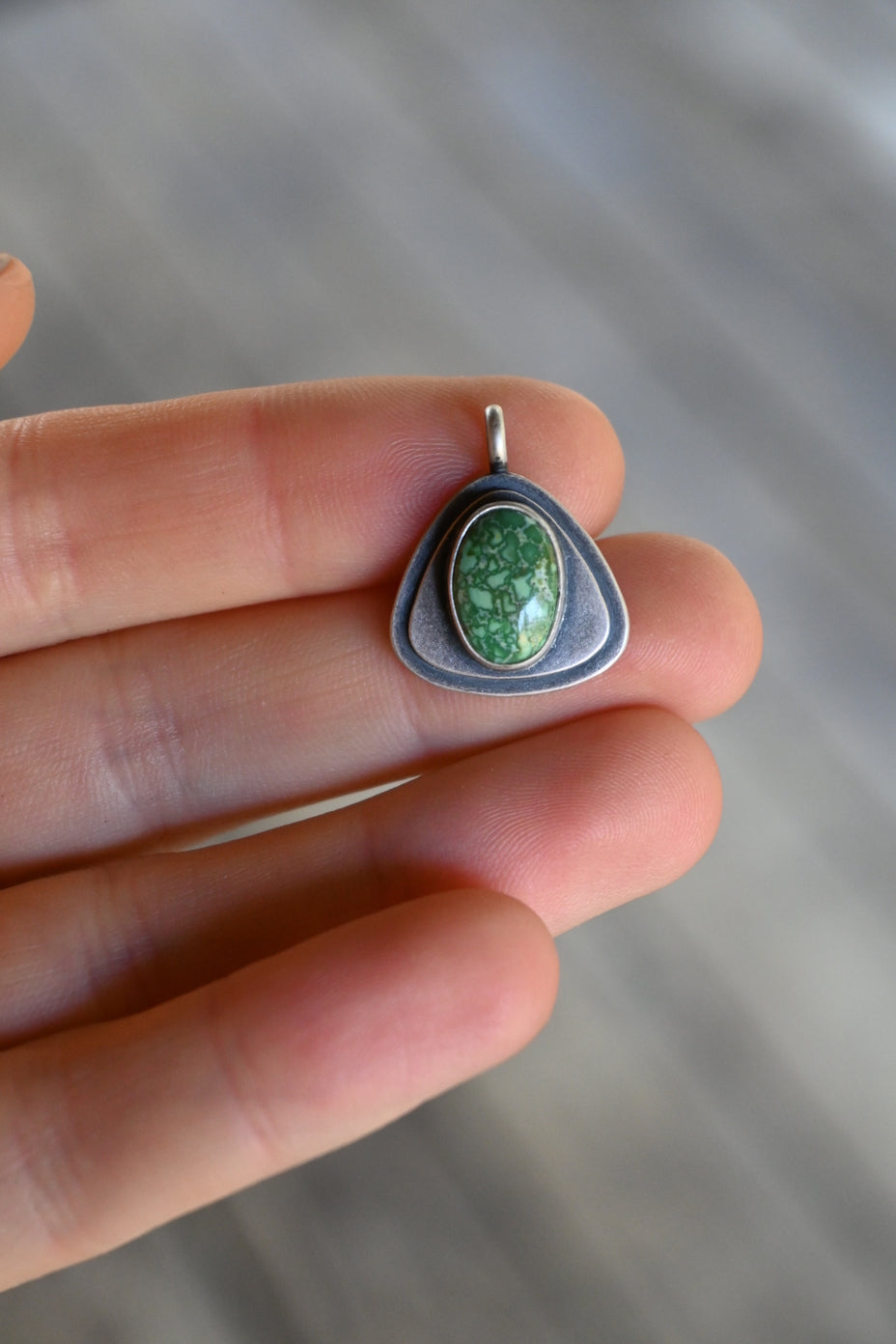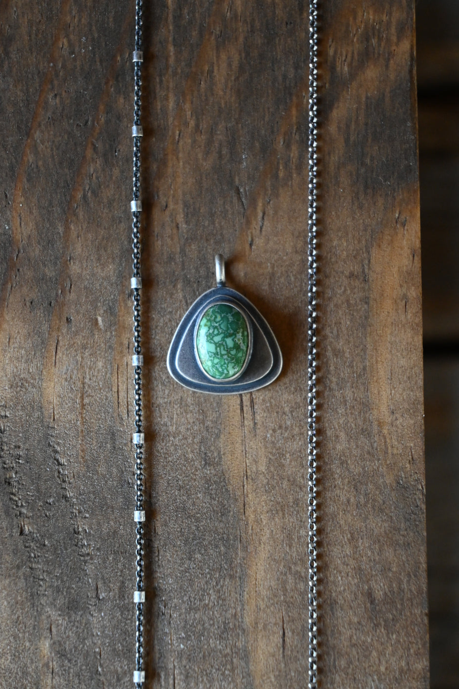 This necklace features a Sonoran Gold turquoise on a sterling silver double layered, hand sawn + accented backing. Dipped in patina and buffed for a matte finish.