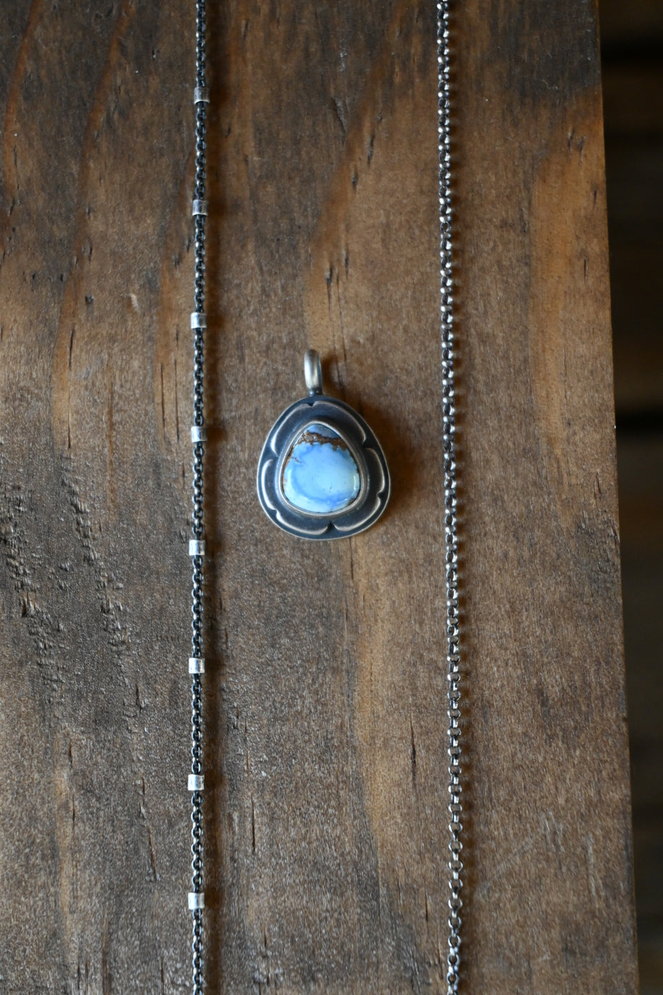 Please specify your choice of chain in the 'Note to Seller' section at checkout, or send an email to cali@oxbowcharlie.com after purchase. You can choose either an 18 inch beaded chain (left) or 16 inch plain rolo chain (right).
