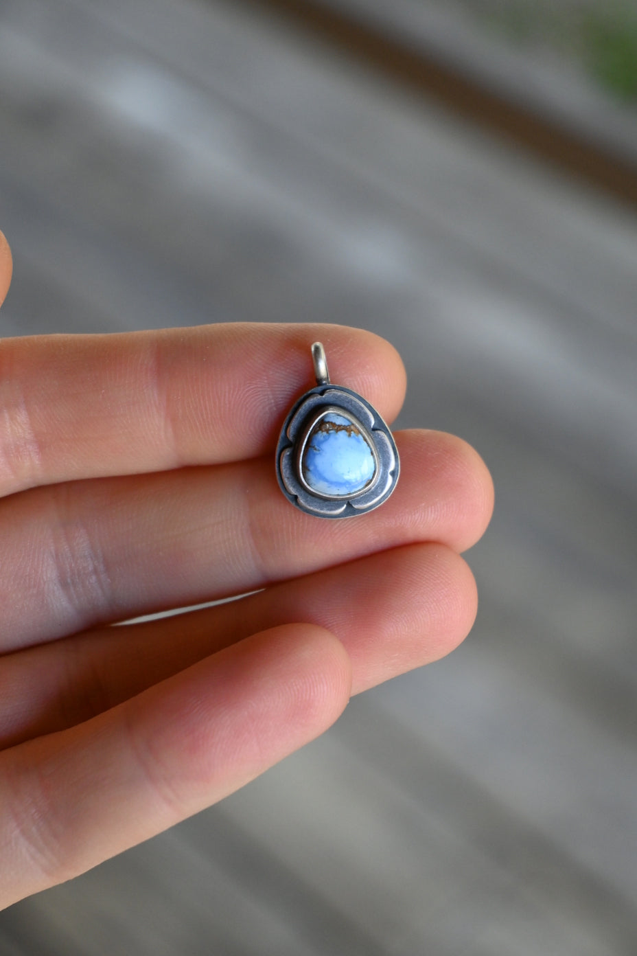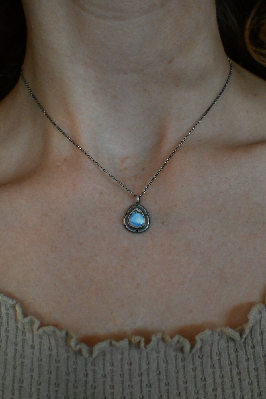 This necklace features a blue Golden Hills turquoise on a sterling silver double layered, hand sawn + accented backing. Dipped in patina and buffed for a matte finish.