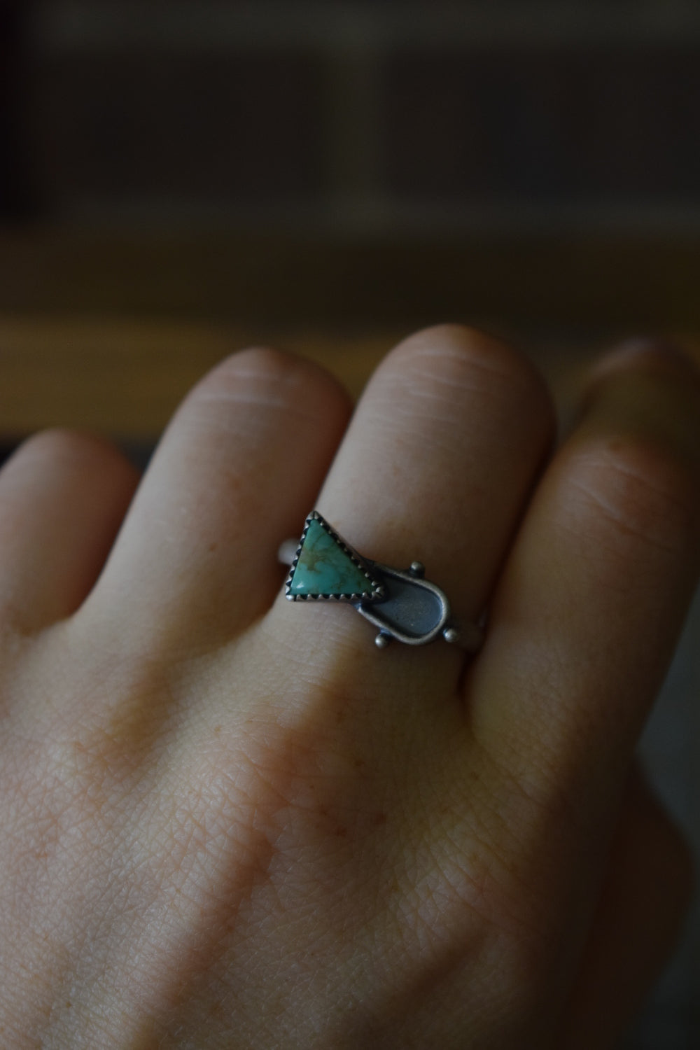 This ring features a beautiful triangular green turquoise, and an arched accent with three dots circling it. Size 9.25. Dipped in patina, and buffed for a matte finish. Crafted with care.