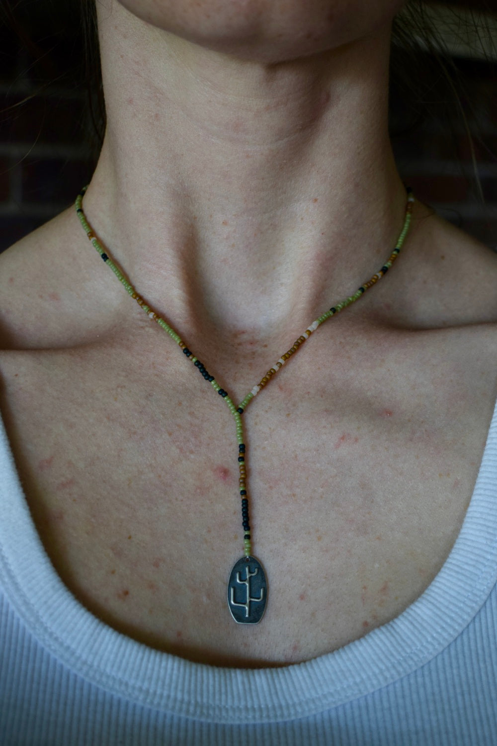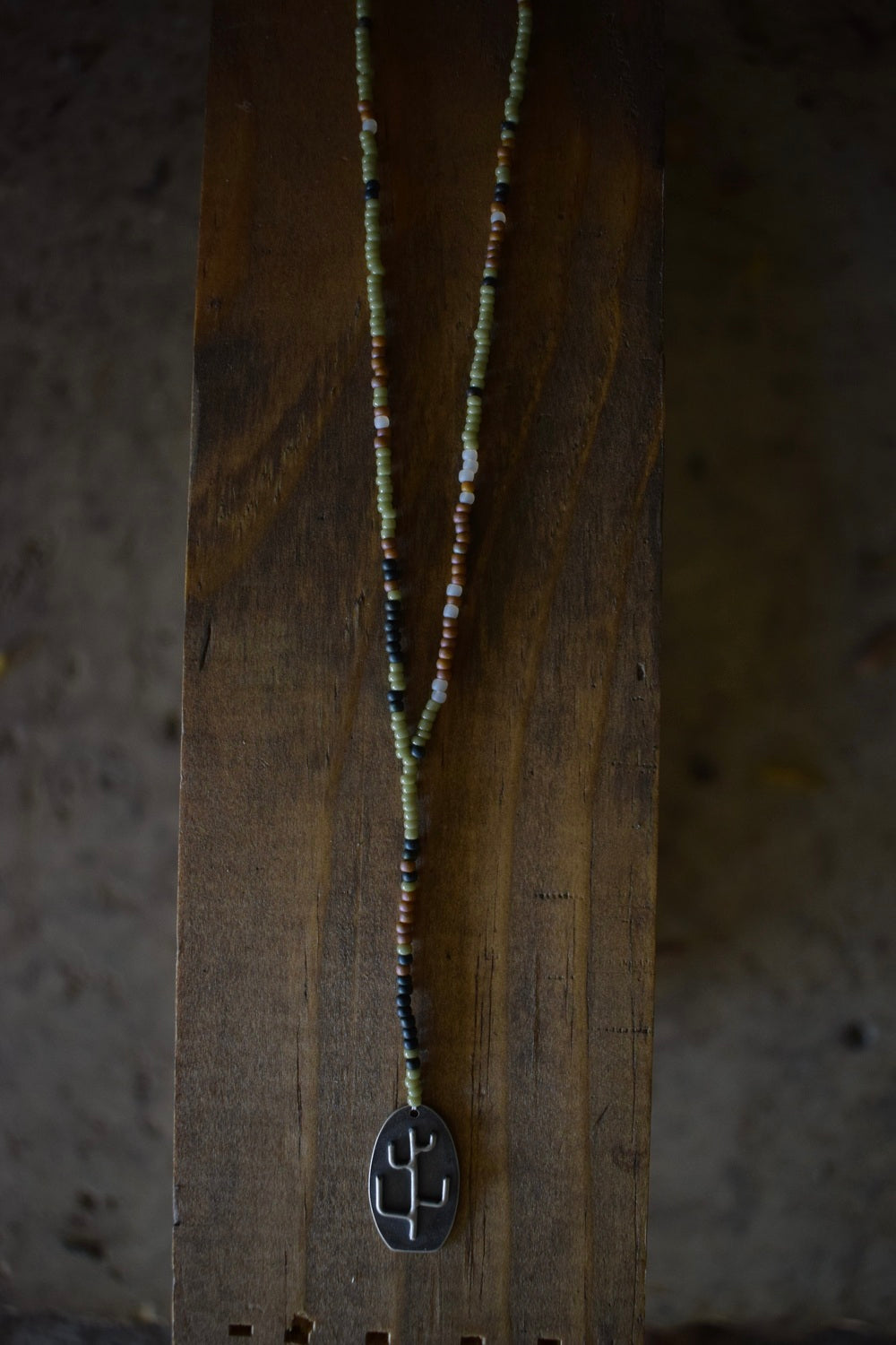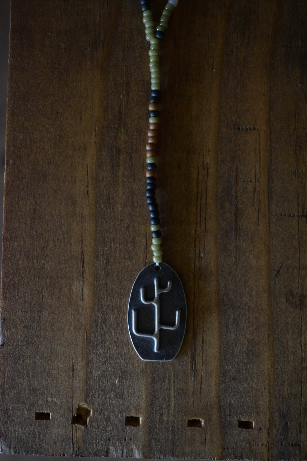 The Cactus lariat is a collaboration piece with Honeysuckle Handmade Studio. It features a hand cut sterling silver cactus charm made by me, and a beaded lariat by HHS. Black, green, clear and tan beads sit on a 17 inch strand, and the charm hangs down on a 2 inch strand from the middle. Handmade with care and one of a kind.