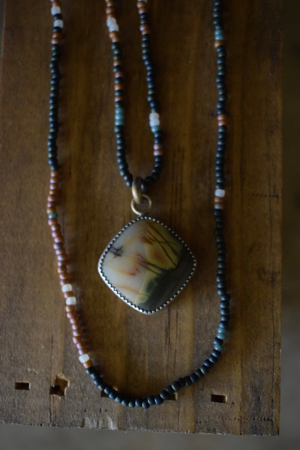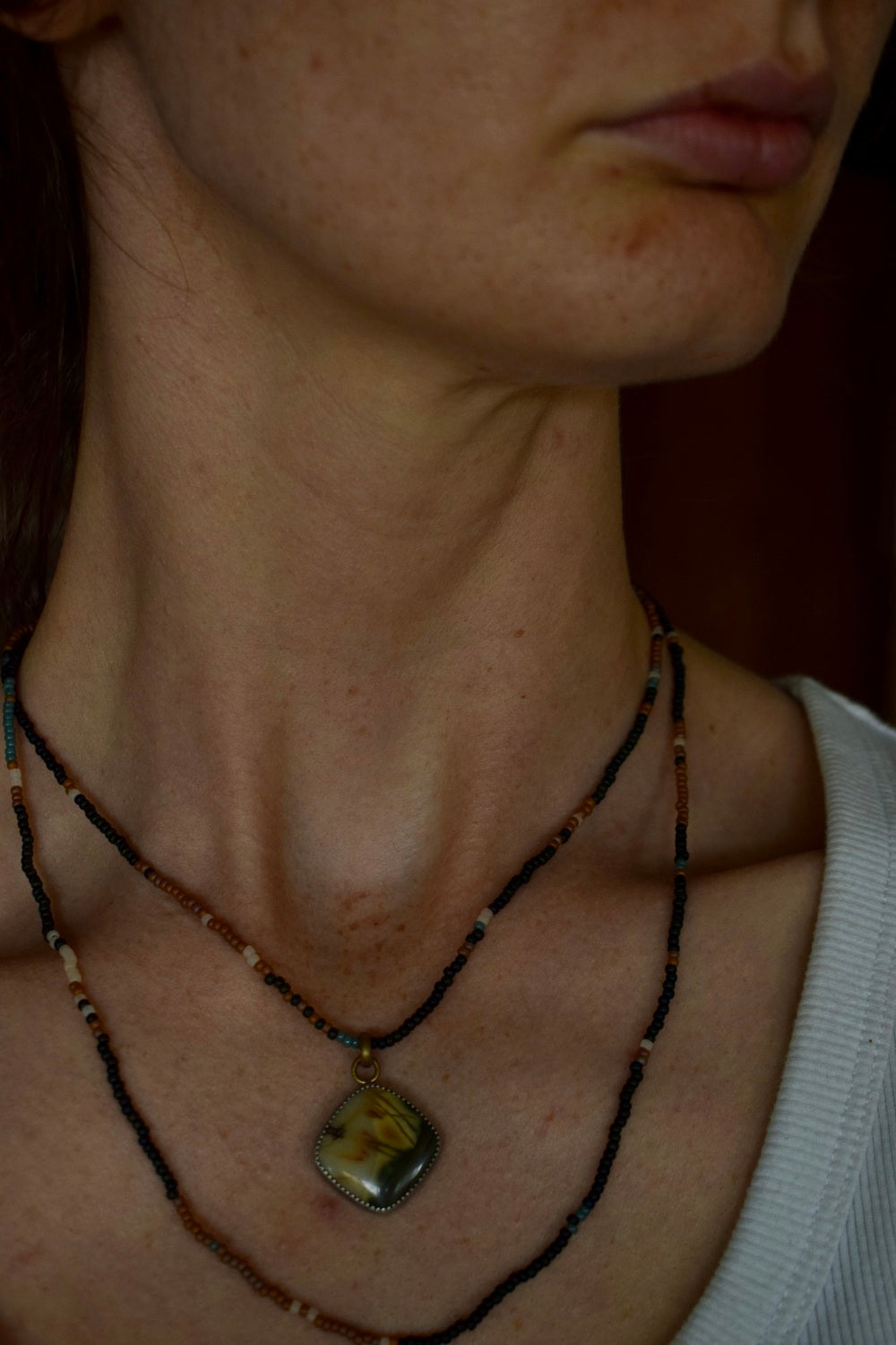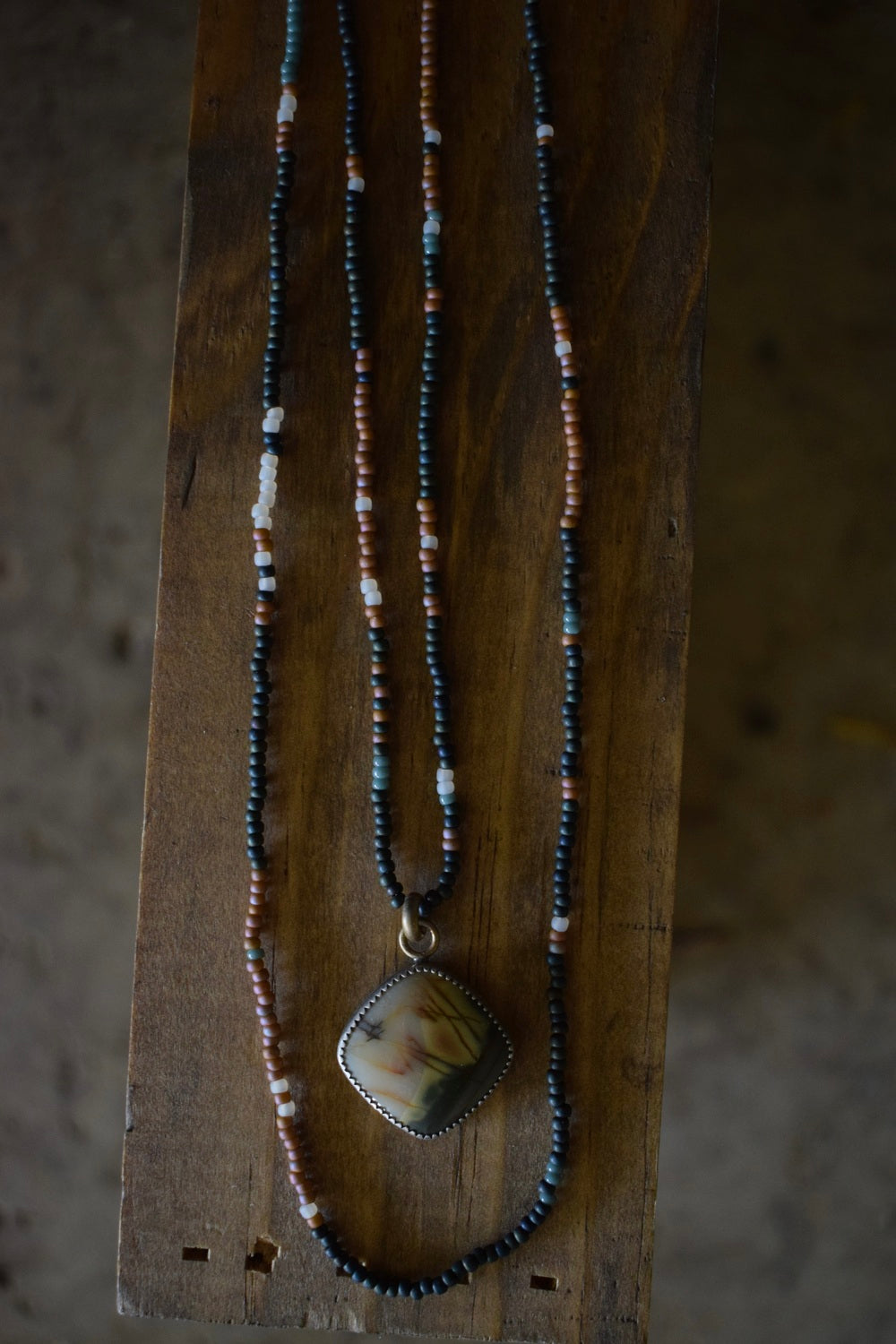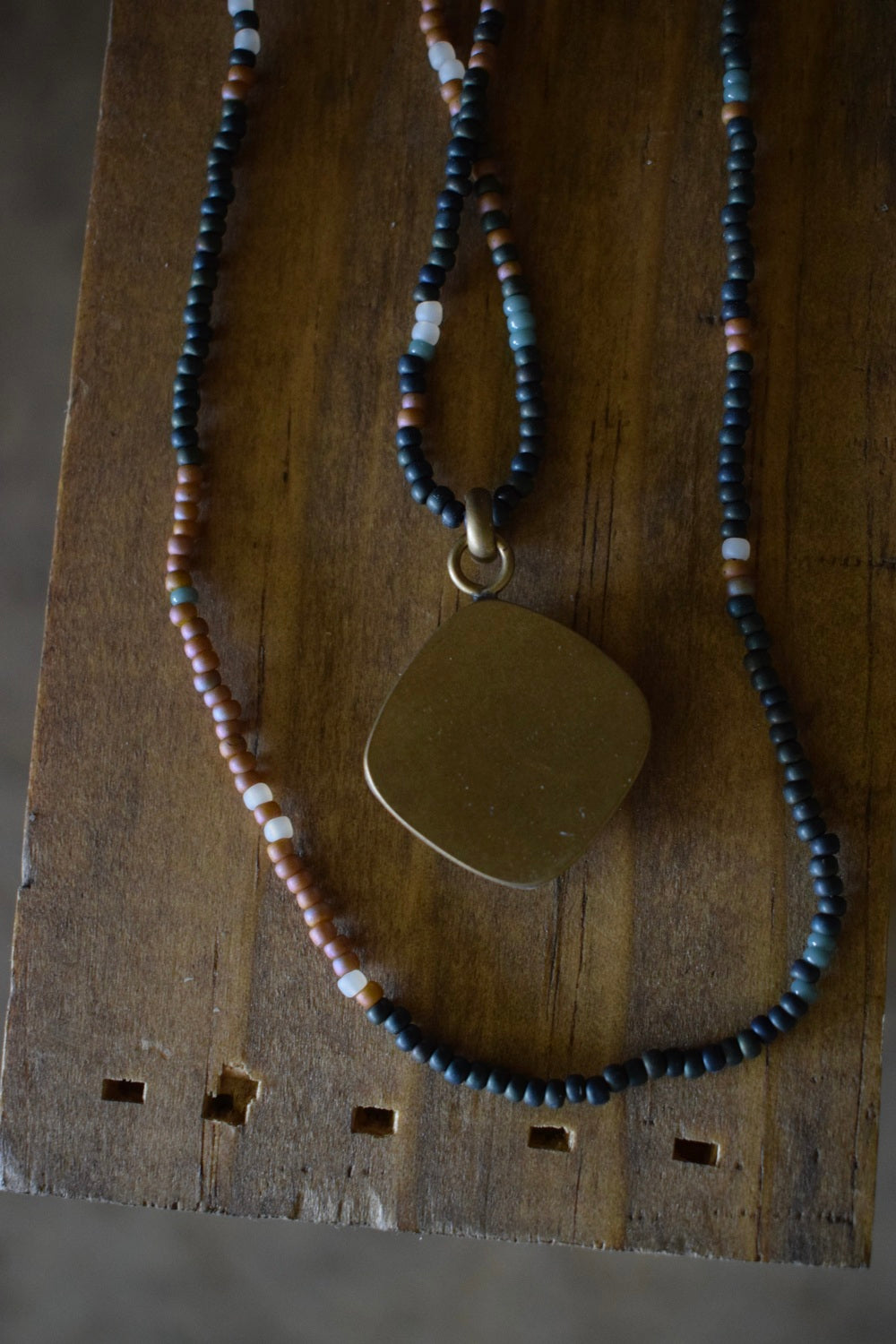 The Cattail necklace is a collaboration piece with Honeysuckle Handmade Studio. It features a stunning Jasper reminiscent of cattails in a marsh on a brass backplate made by me, and a beaded double strand necklace by HHS with brown, black, blue and clear beads. Shorter strand with the jasper is 17 inches, and the other hangs about 3 inches below. Handmade with care and one of a kind.