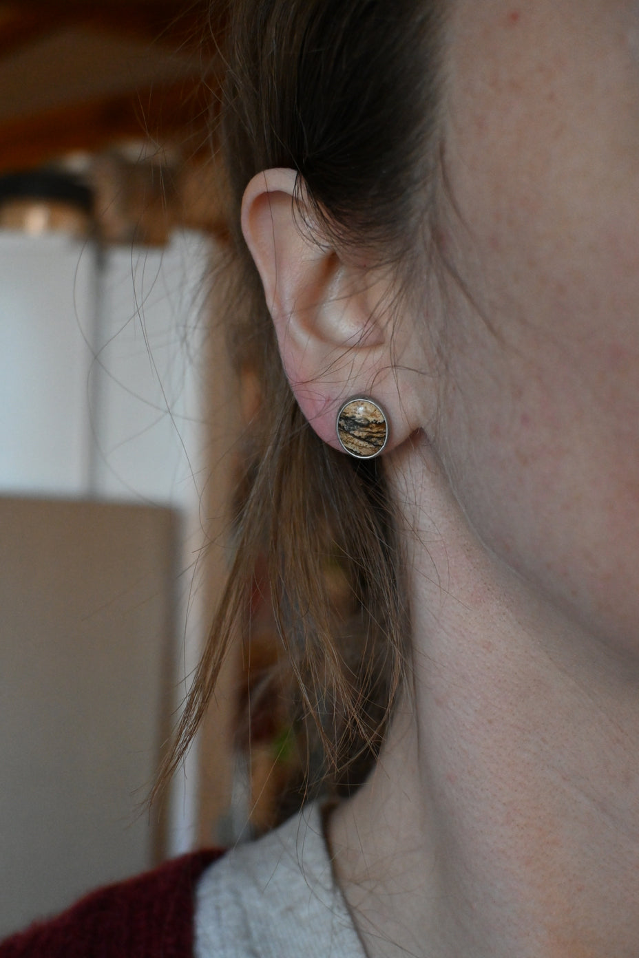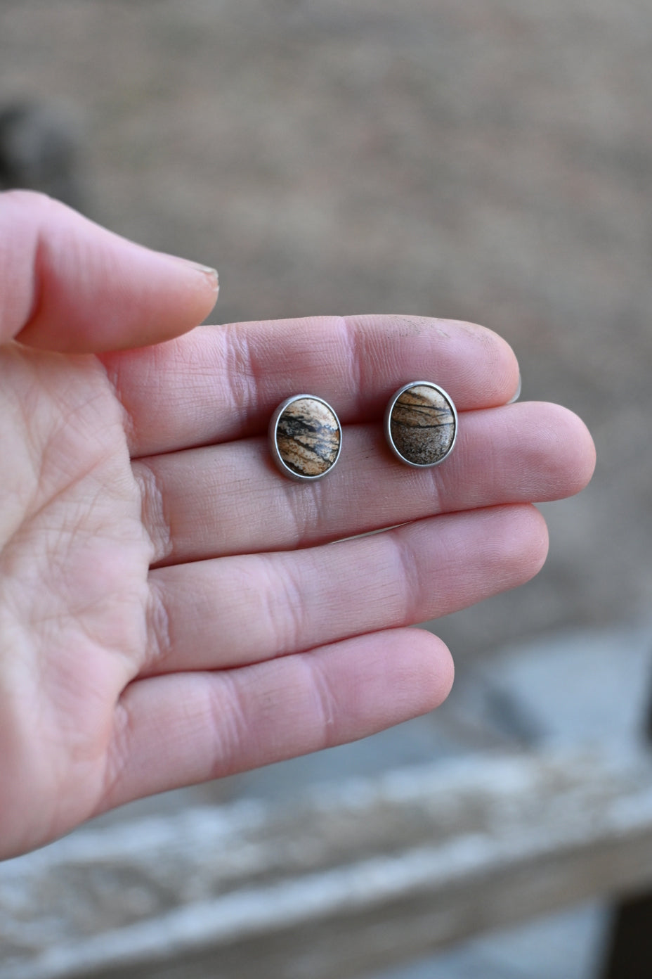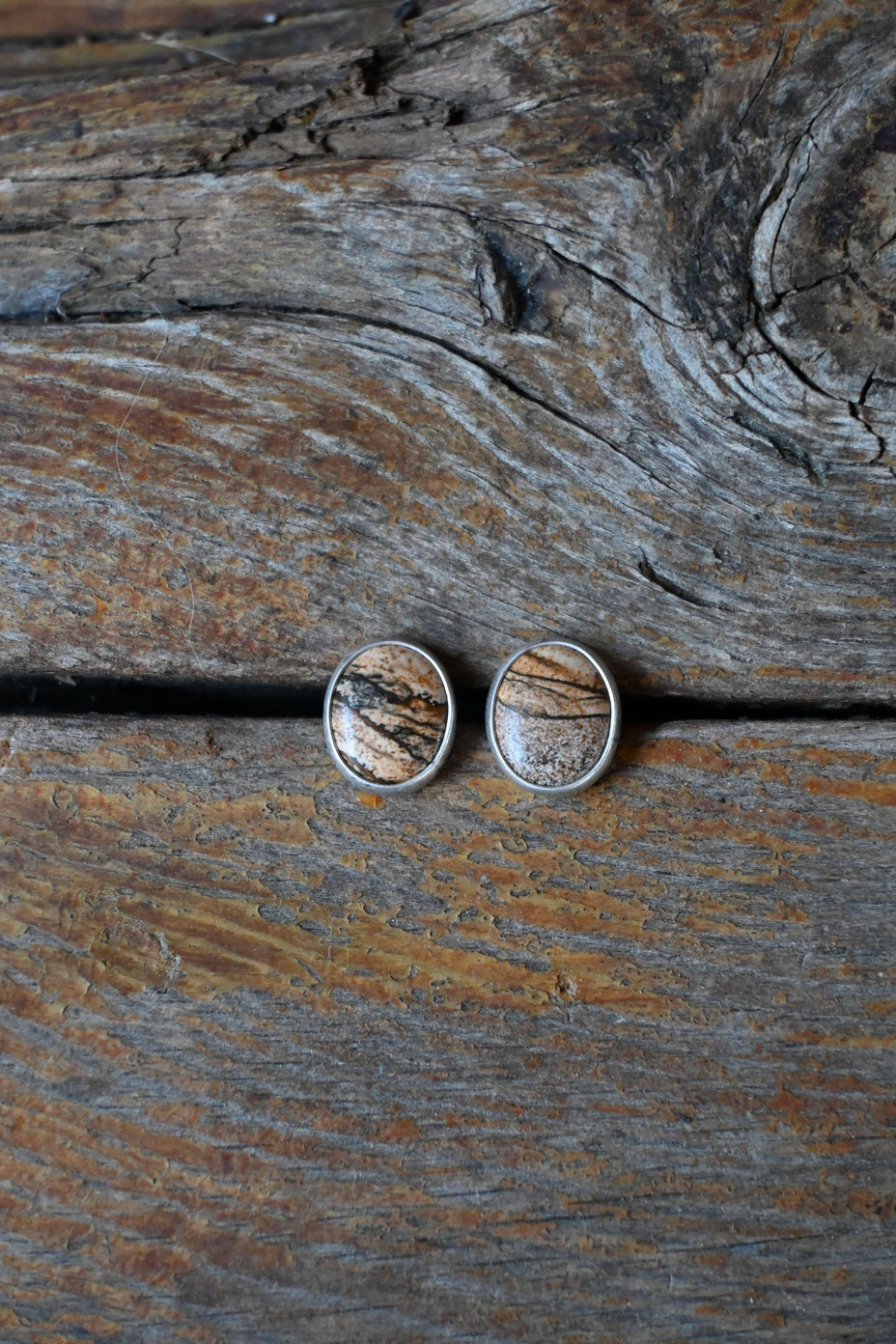 These studs feature gorgeous desert Picture Jasper stones. Sterling silver, dipped in patina and buffed for a dark, matte finish.