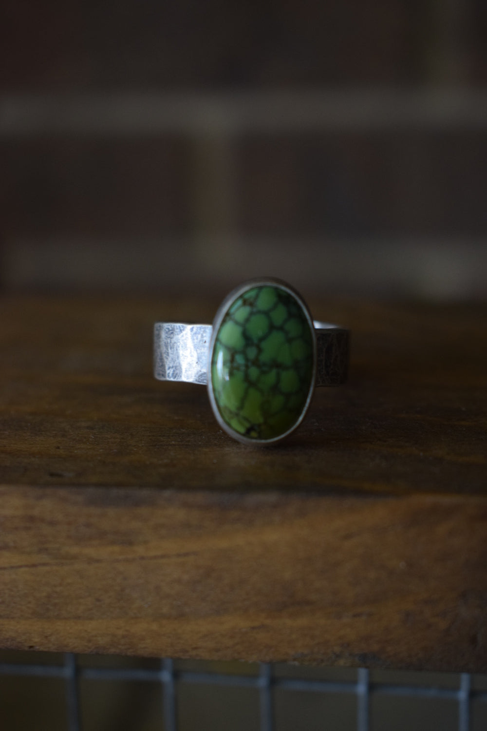 A gorgeous green Bao Canyon turquoise sits on a heavy, hand hammered band. Size 10. Dipped in patina and buffed for a matte finish. Handmade with care, one of a kind.