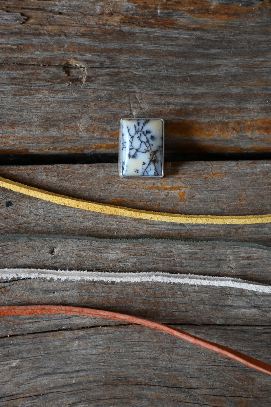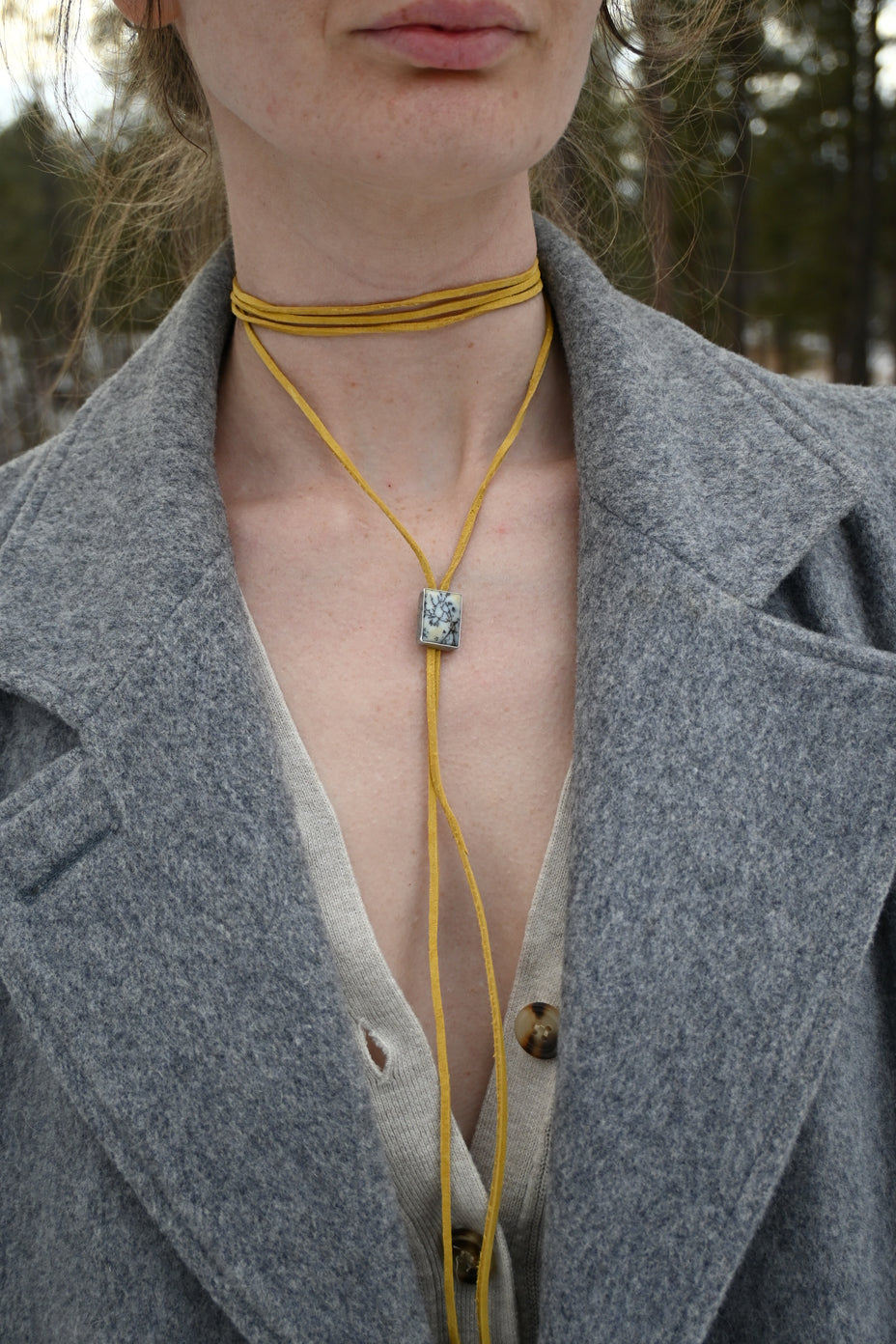 The Ivy Wrap. With a suede cord and a beautiful dendrite stone slide. Cord can wrap roughly 3-5 times around the neck depending on wear--note that there is no clasp, it's put on just by wrapping. The cord is roughly 90 inches long with simple knots tied at the bottom, so it can be cut and retied if you'd like to wear at a shorter length.