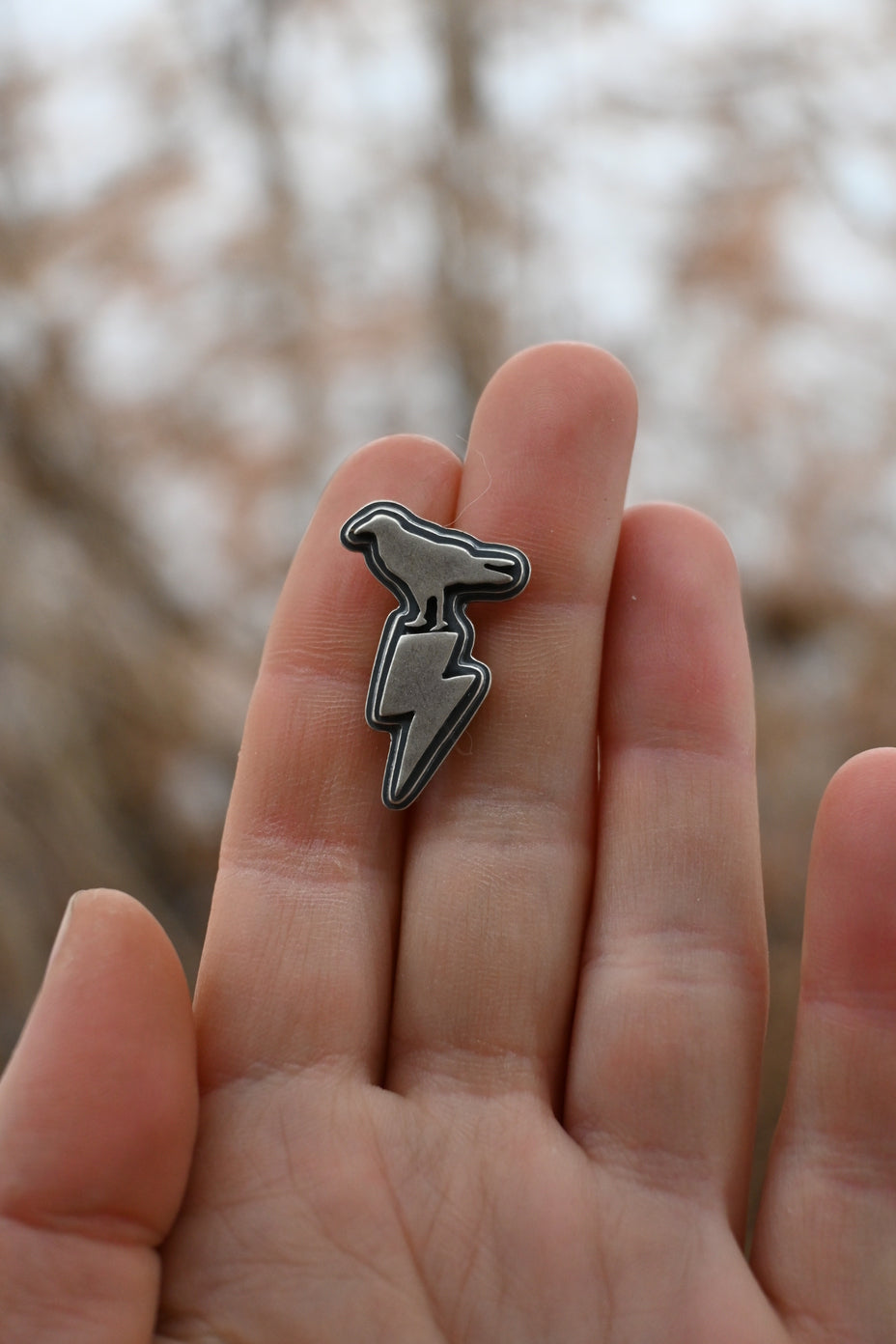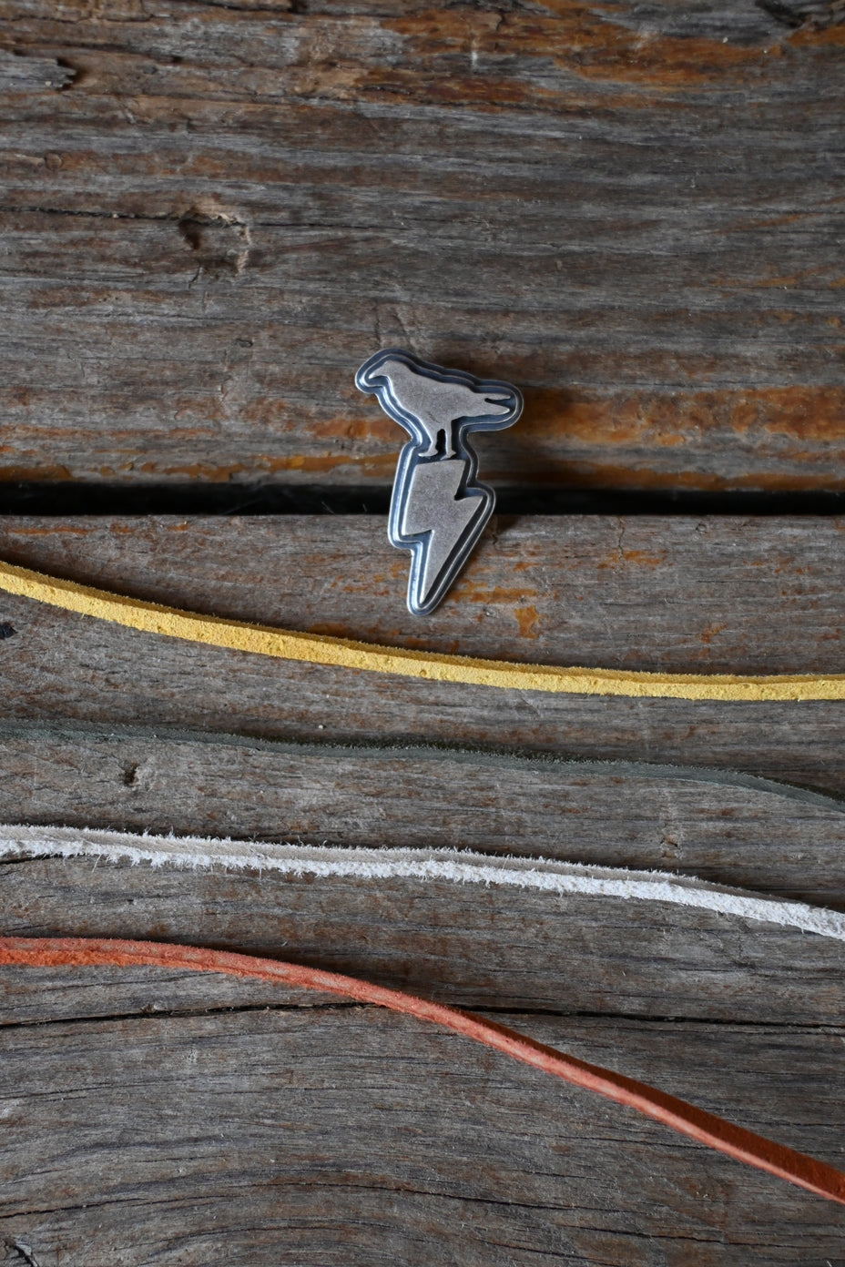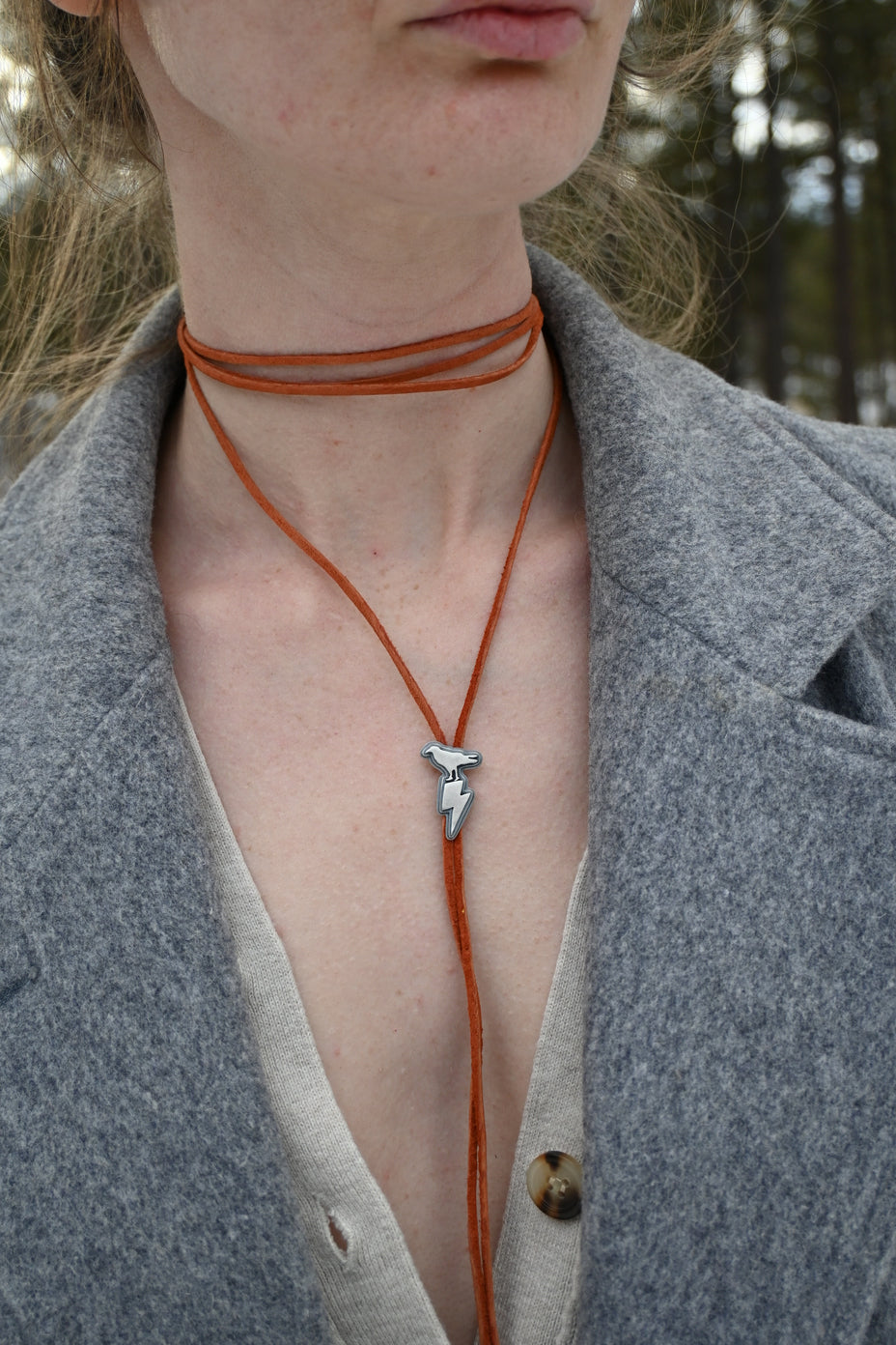 The Ivy Wrap. With a suede cord and a triple layer sterling silver slide of a raven and a lightning bolt. Cord can wrap roughly 3-5 times around the neck depending on wear--note that there is no clasp, it's put on just by wrapping. The cord is roughly 90 inches long with simple knots tied at the bottom, so it can be cut and retied if you'd like to wear at a shorter length.