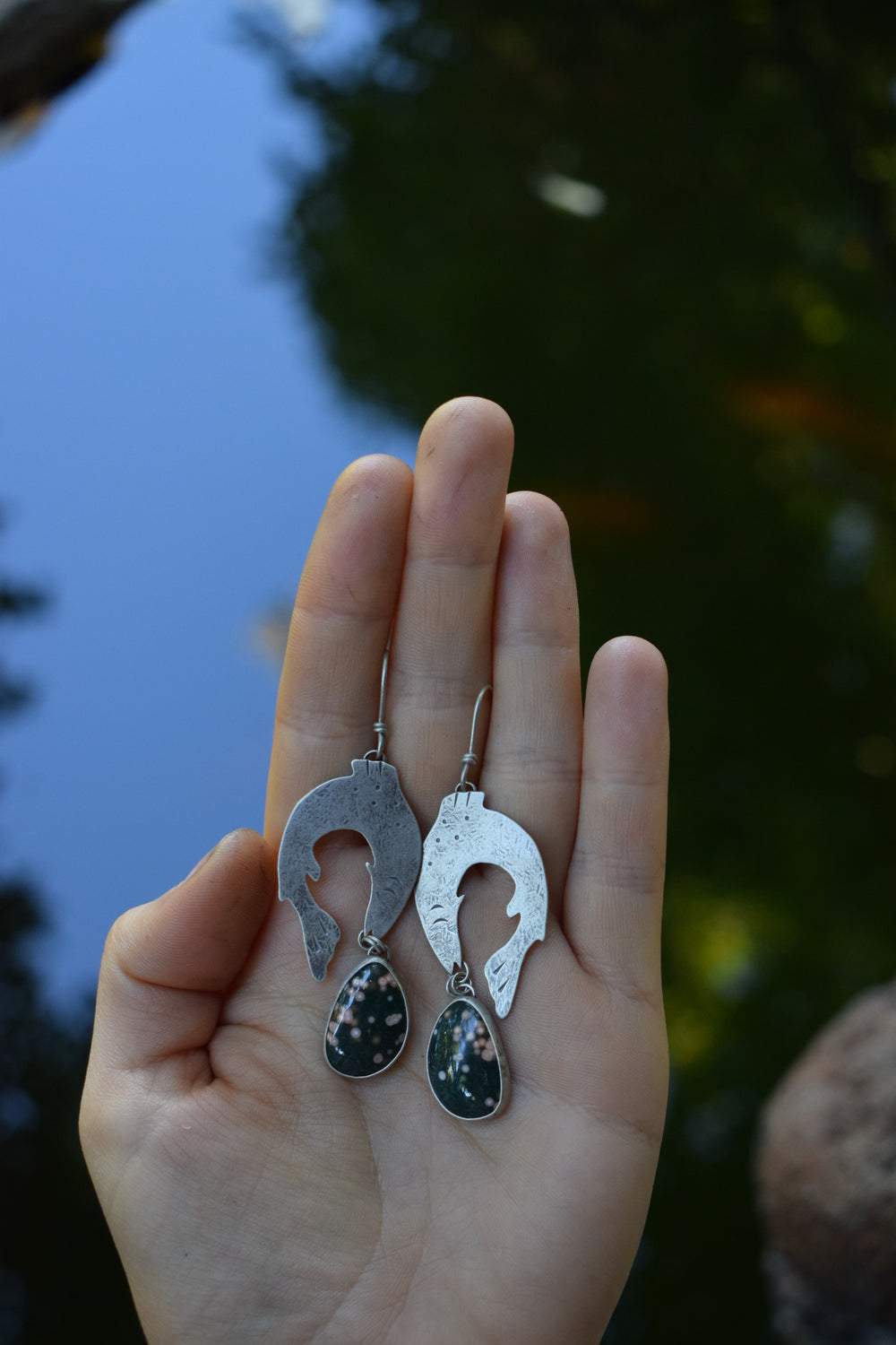 The Kala earrings feature hand drawn and textured sterling silver fish, and teardrop ocean jasper's, green with orange spots, hanging below. Lightweight and one of a kind. Handmade with care. For the lover of water dwellers.