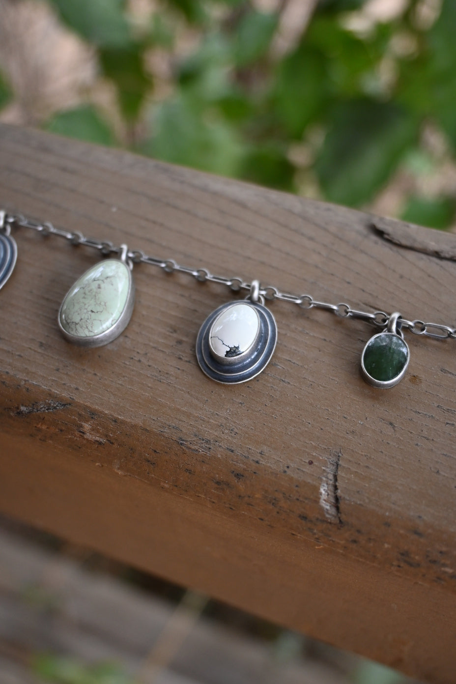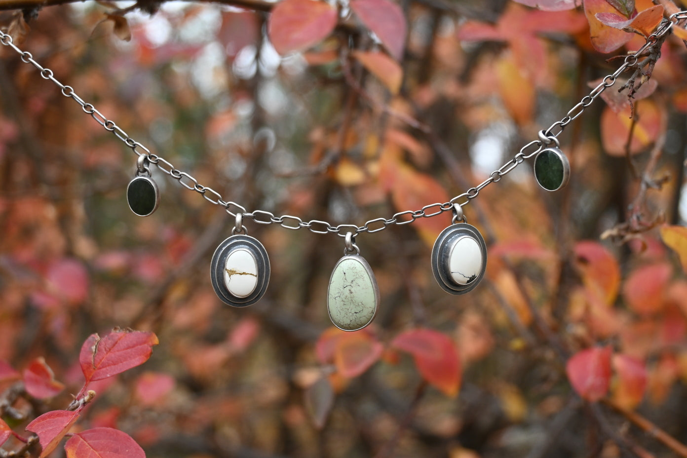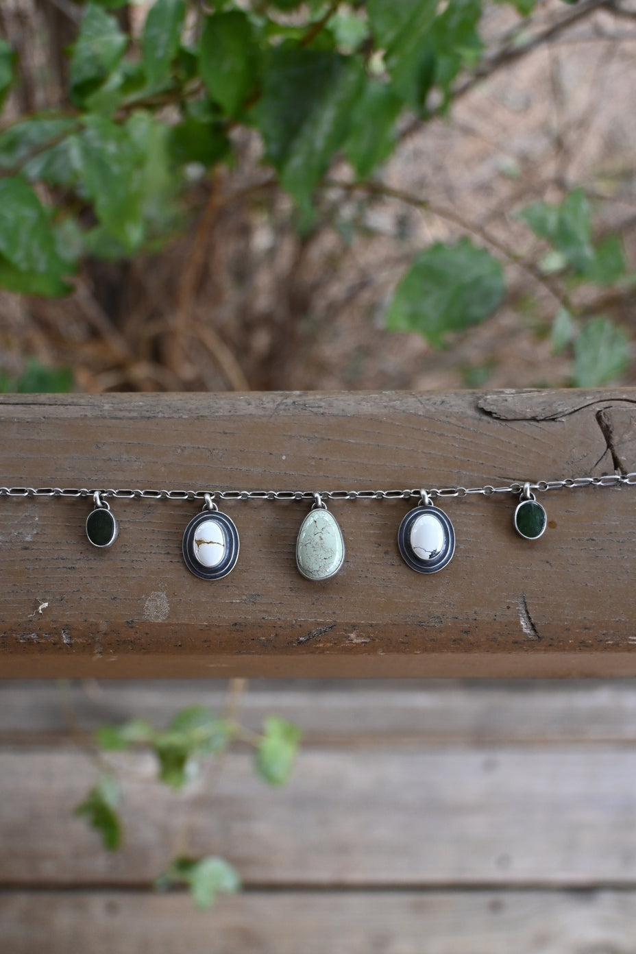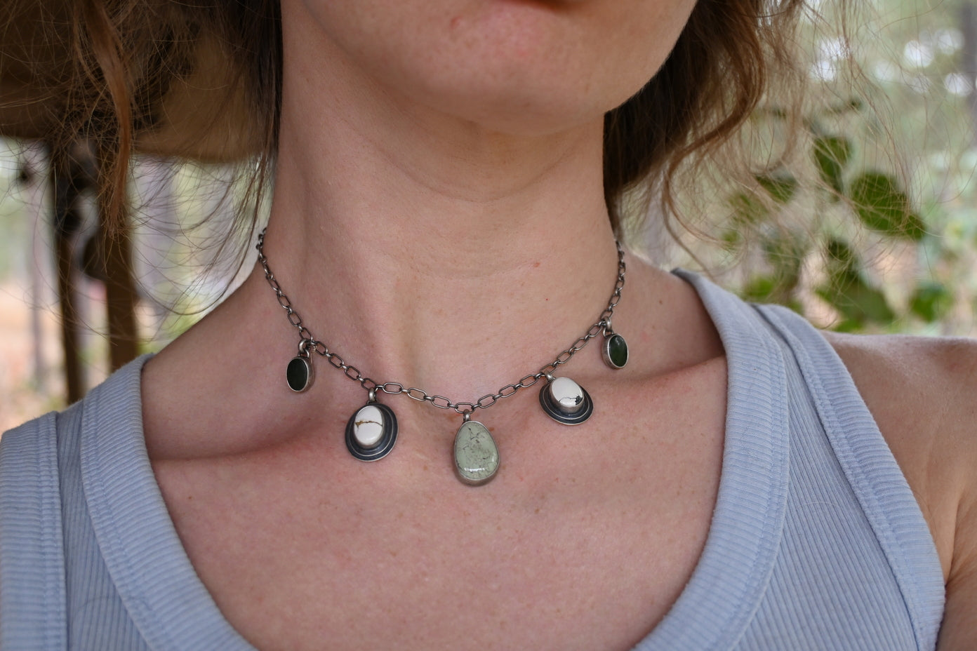 This choker features a beautiful light green Egyptian turquoise at center, on each side a double backed Ivory Creek Variscite and dark green Wyoming Jade. Made for things that grow and palettes of the earth. Crafted entirely in sterling silver, the chain is adjustable up to 17 inches. Dipped in patina and buffed for a dark, matte finish.