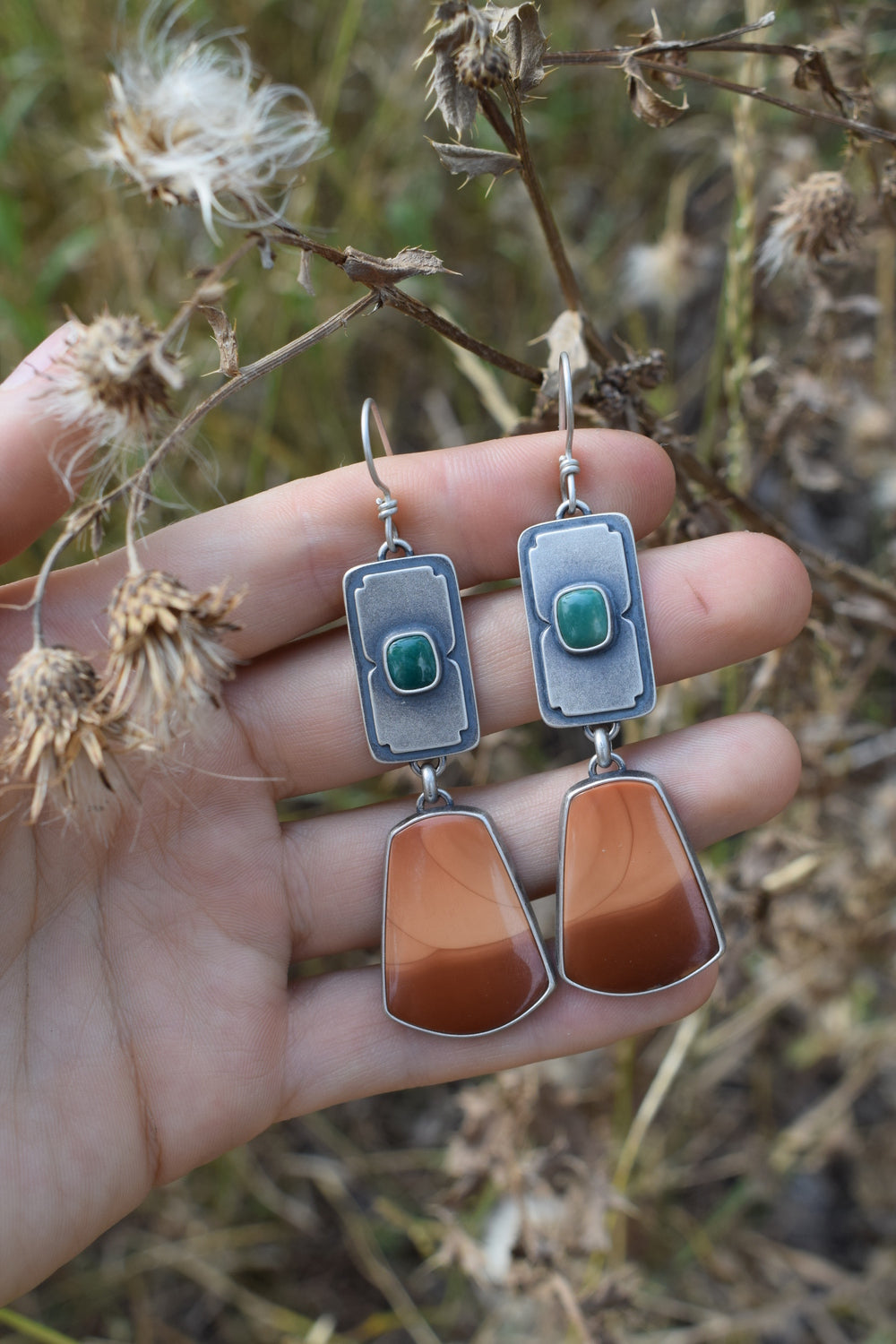 These earrings, set all in sterling silver, feature deep green Royston turquoise on a hand cut + detailed double layered art deco backing. Below them hang gorgeous Bruneau Jasper stones (one is slightly larger than the other). The backside is cut out so you can view the stone from all angles. They measure 3 inches from the top of the ear wire, and each weighs 9.5 grams. Dipped in patina and buffed for a dark, matte finish.