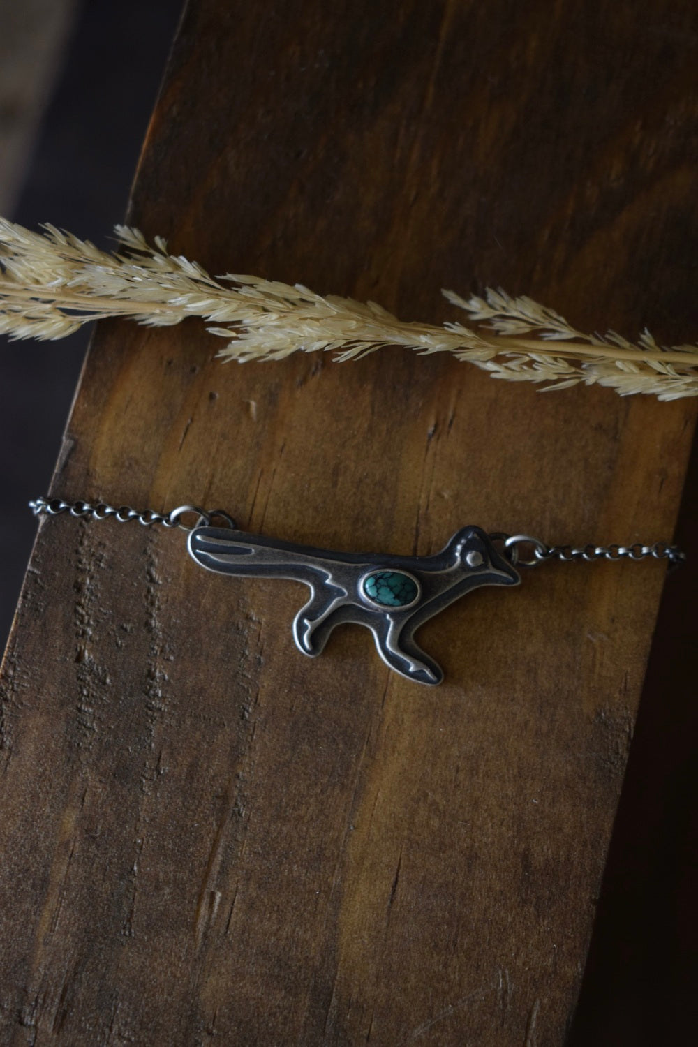 A sterling silver roadrunner sits with a green Cloud Mountain turquoise in the center. On a 15 inch sturdy chain, adjustable up to 17 inches. Handcrafted slowly, dipped in patina and buffed for a matte finish.