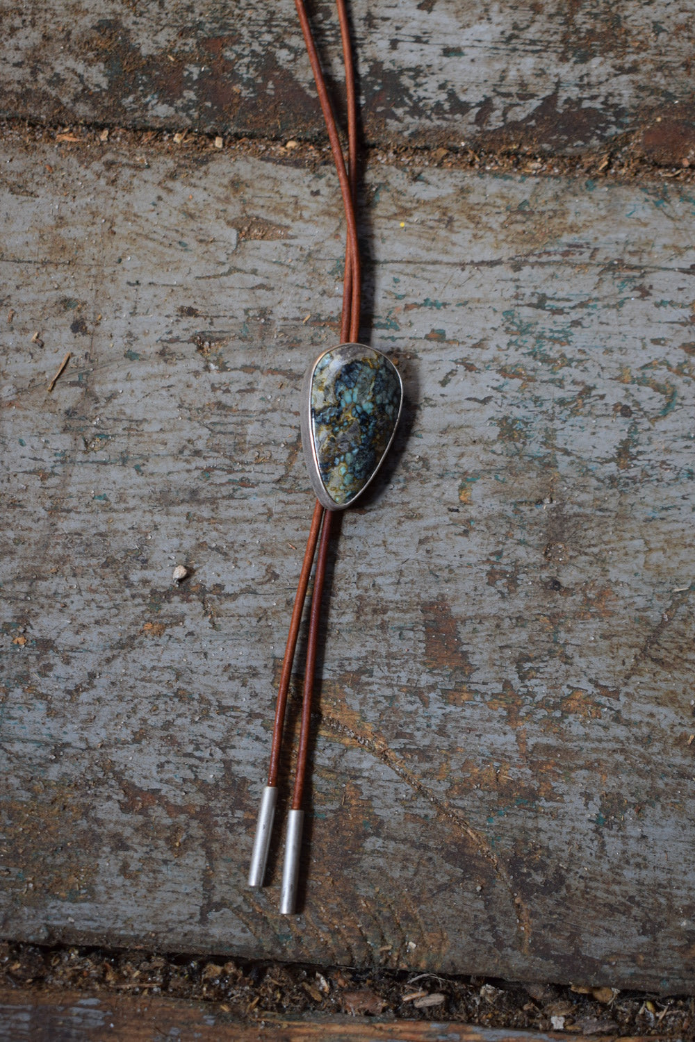 This sweet + simple bolo features a thin brown cord, handmade bolo tips and a gorgeous teardrop Seven Dwarfs Turquoise stone slide. Sterling silver + leather, cord measures 36 inches. Handmade with care and one of a kind.