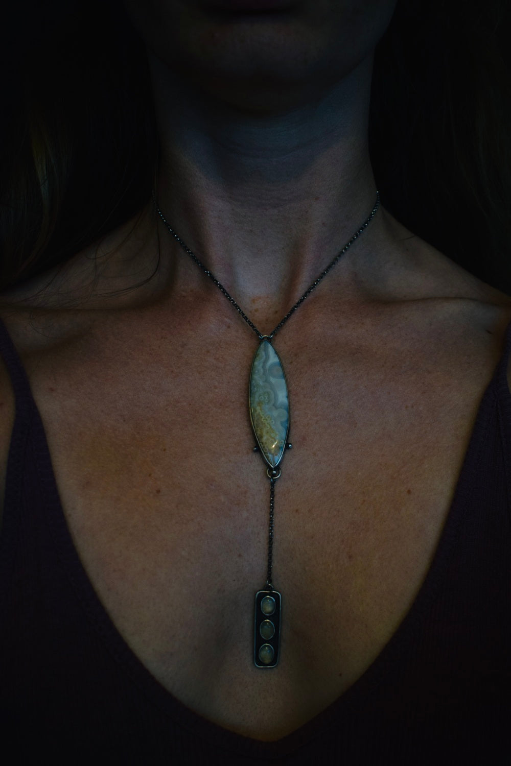 The Aisa Necklace features a long, detailed, and striking ocean jasper. Three dots sit around the bottom edge, and below it hangs three natural jade stones on a rectangular backplate. Built for frozen waterfalls, for winter frost. The backplate on the main stone is open with two teardrop shape cutouts to showcase the colors and patterns. The ocean jasper sits fixed on a 15.5 inch chain, and the rest dangles 3 inches below. Handmade with care, completely one of a kind.