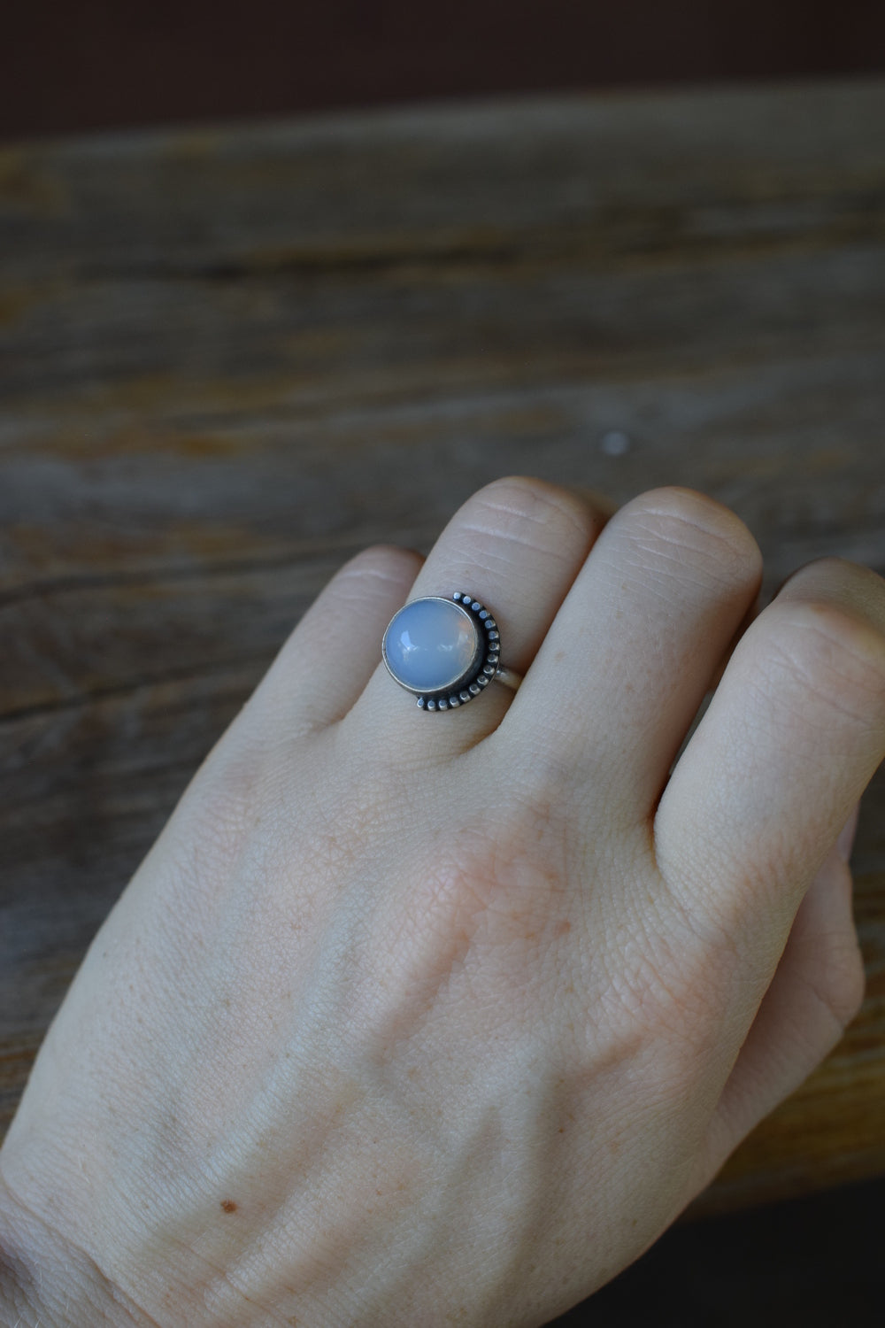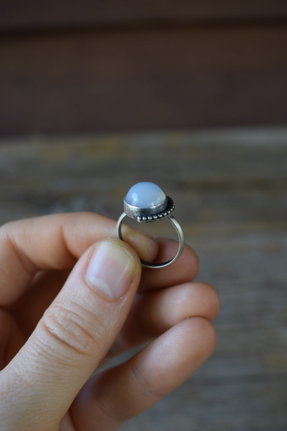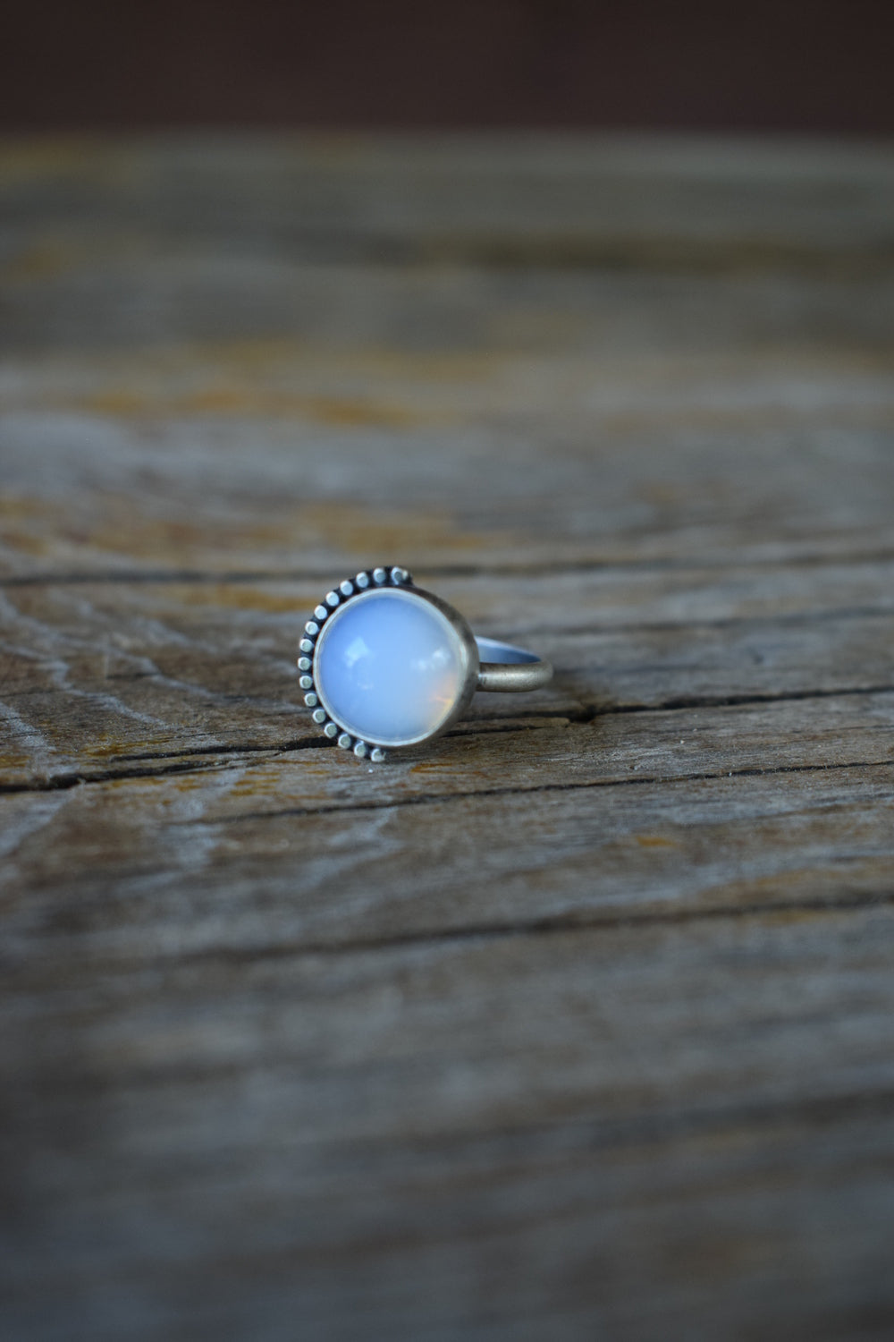 A beautiful high domed purple Mexican Jelly Opal sits half surrounded by a round dotted border. Set in all sterling silver, on a simple thin band. Size 6-6.25, dipped in patina and buffed for a matte finish.