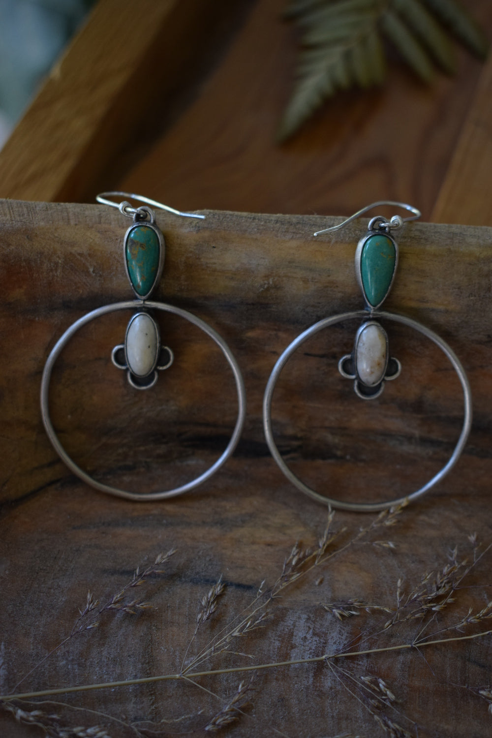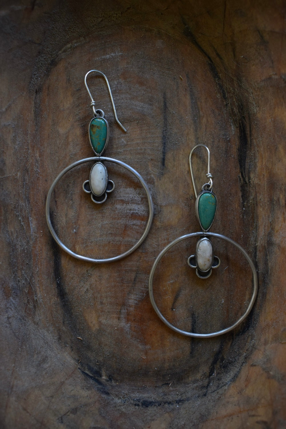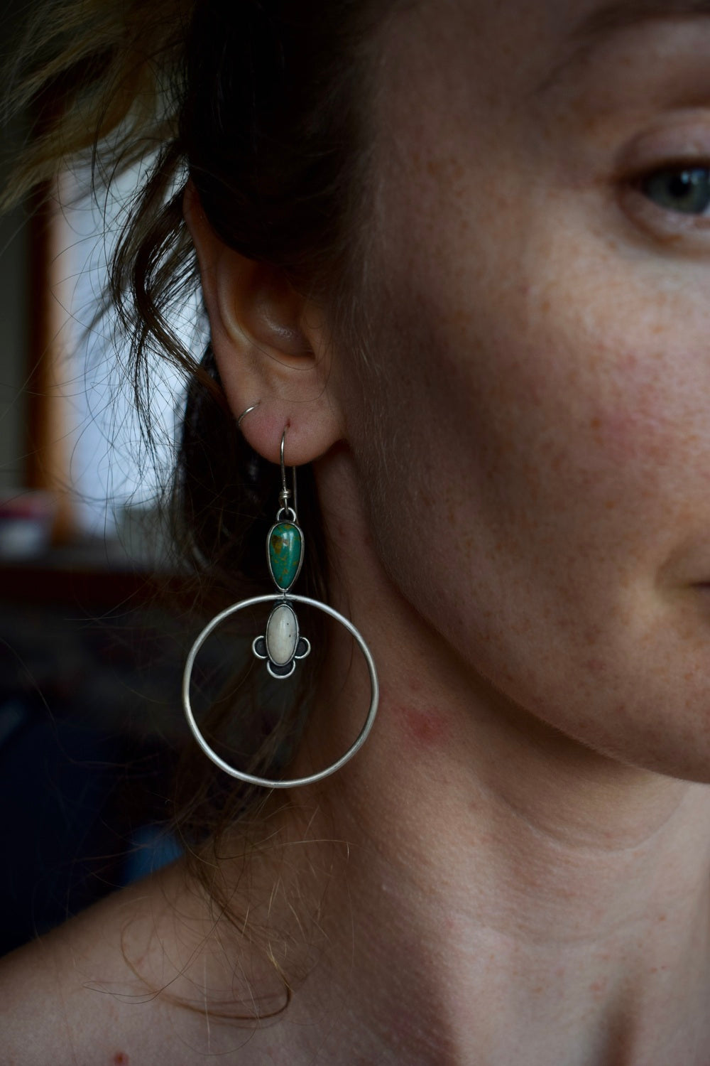 The Aven Hoops feature two dark green Tyrone turquoise stones above speckled White Buffalo turquoise. Small details sit below, like petals on a flower. Made for the silent moments spent with pine trees in the snow. Added patina and hand buffed for a matte finish. One of a kind.