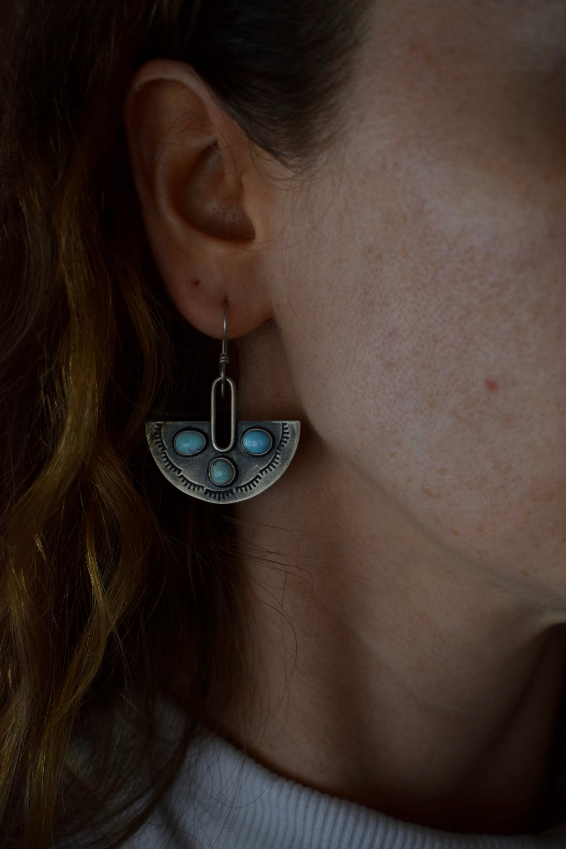 These earrings feature six small Blue Gold Turquoise stones set on a half round sterling silver hand stamped backplate. Dipped in patina and buffed for a matte finish. Measuring about 1.75 inches from the top of the ear wire. Made with intention for the sky + the dirt.