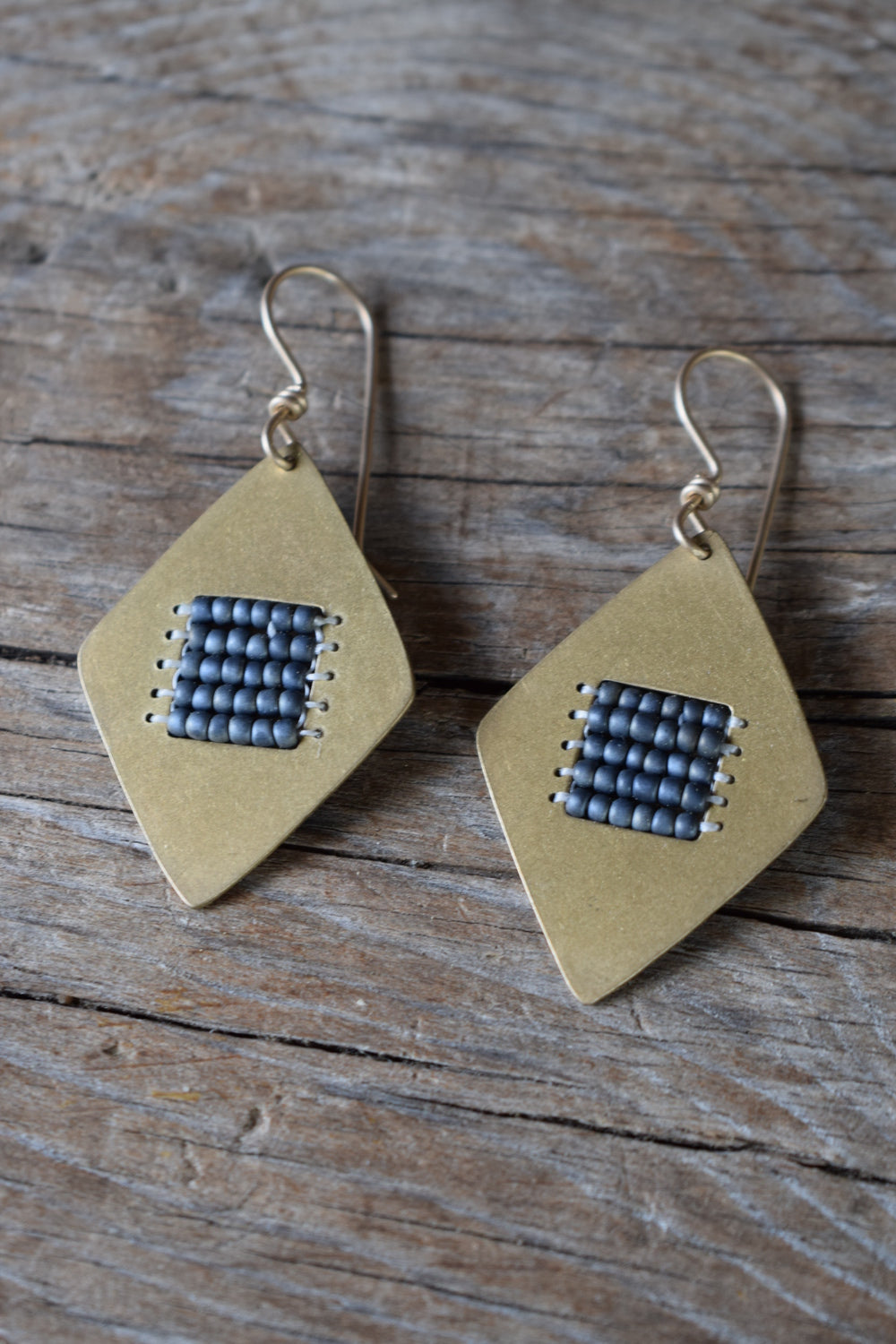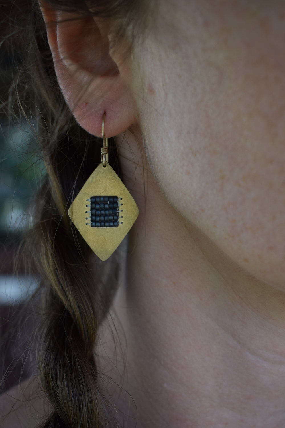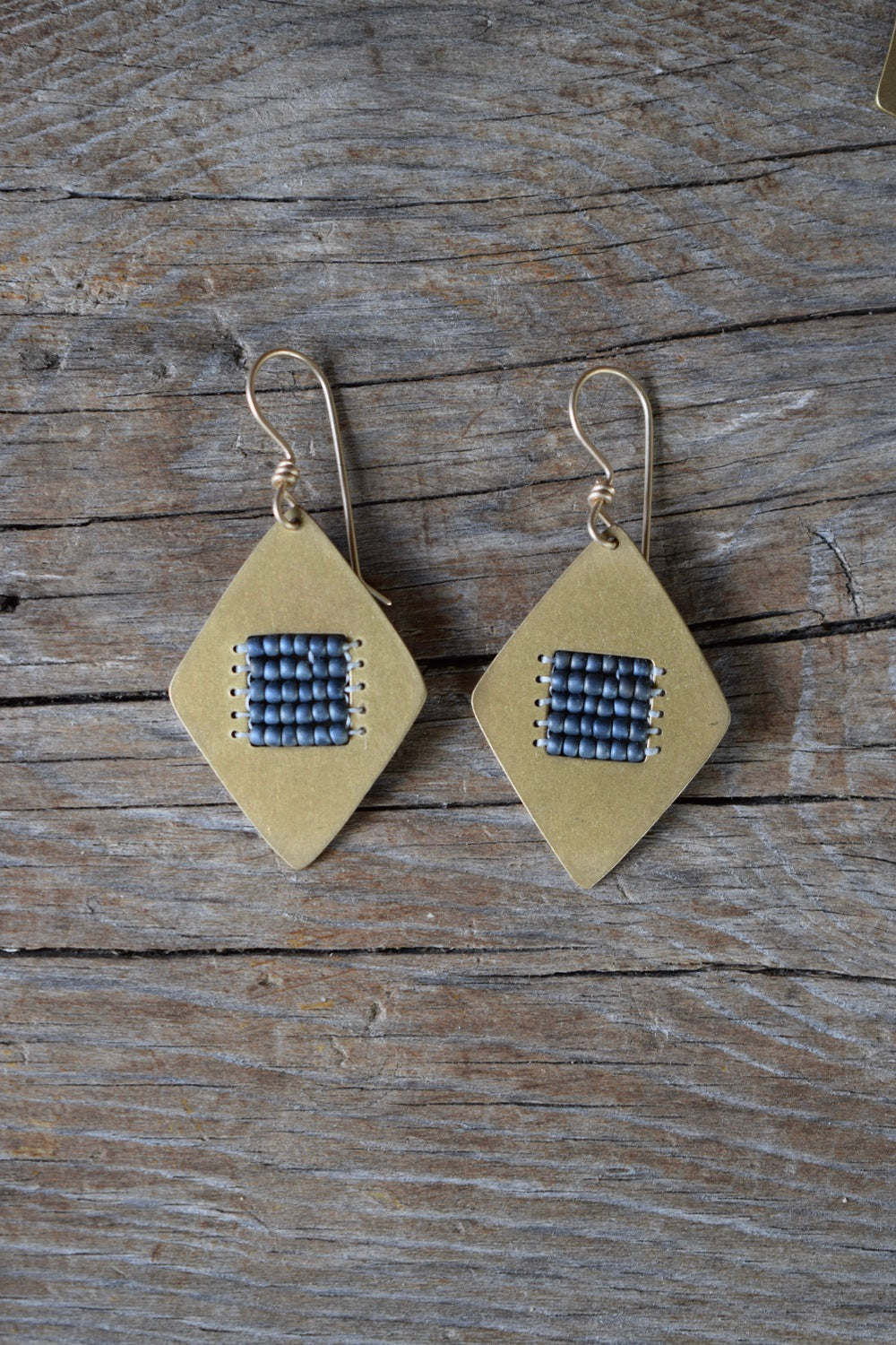 Brass kite shapes with a central handwoven dark blue beaded square. 14k gold fill ear wires, simple and for everyday. Measuring just over 2 inches from the top of the ear wire.