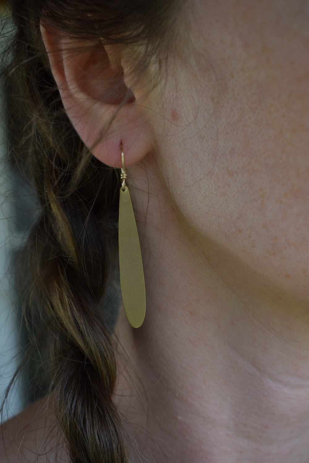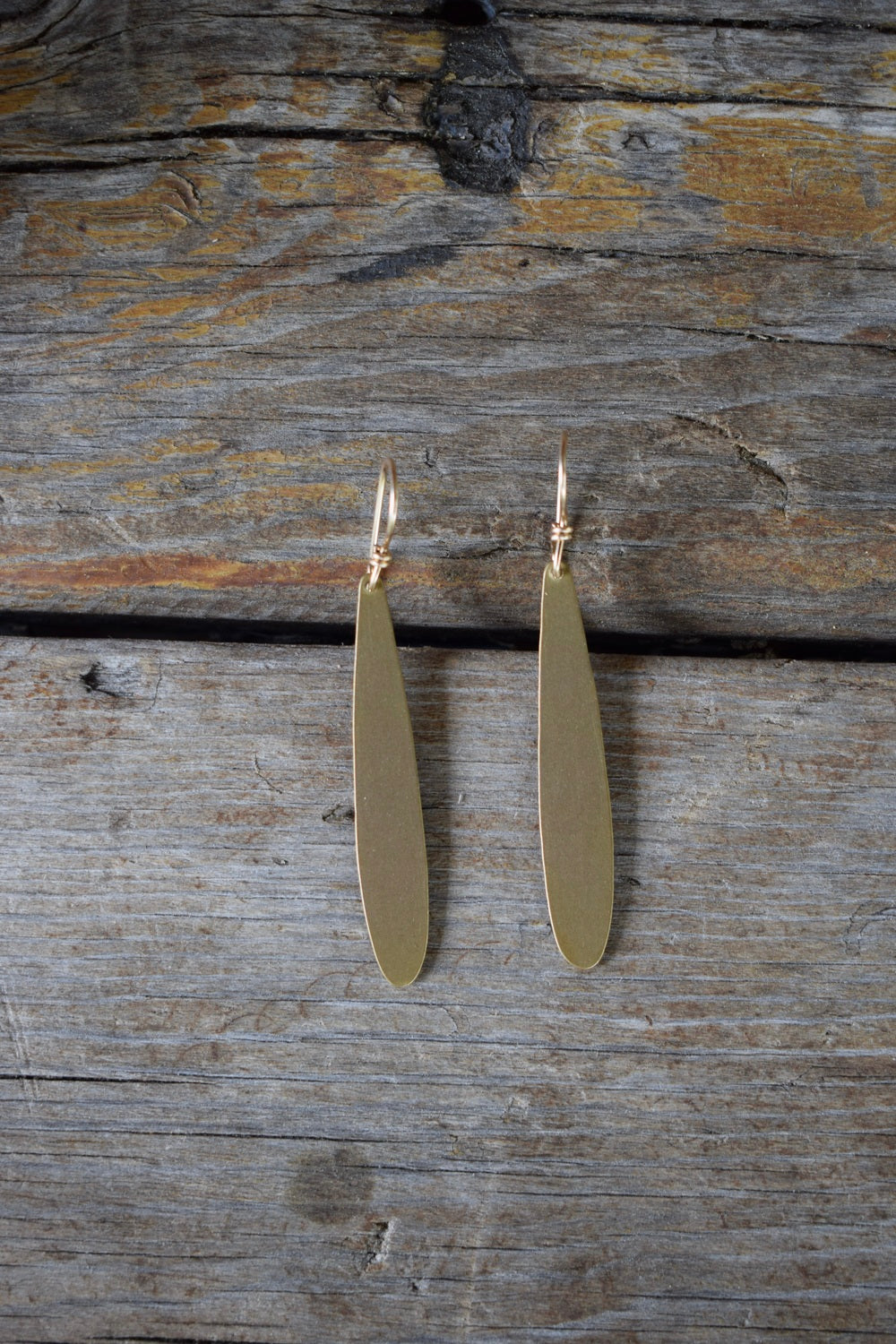 Simple thick gauge brass raindrop earrings with 14k gold fill ear wires, simple and for everyday. Measuring just under 3 inches from the top of the ear wire.