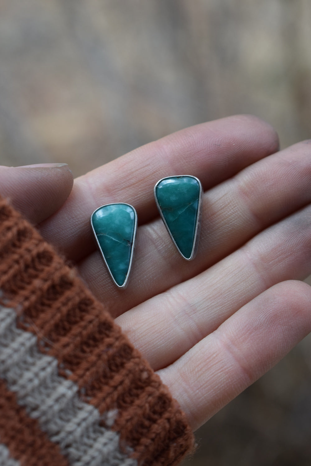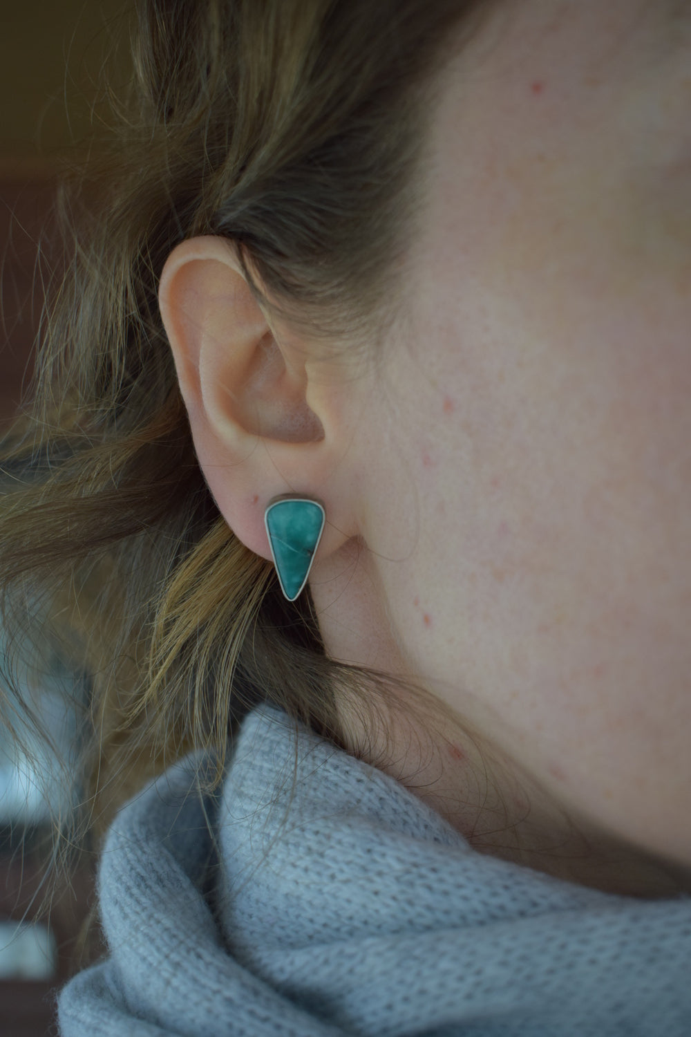 These studs feature deep blue triangular Campitos turquoise stones set in sterling silver. Dipped in patina and buffed for a dark, matte finish.
