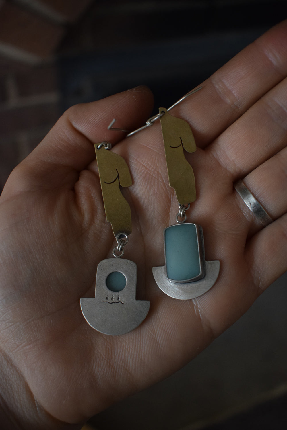 The Circe Vessel Earrings are named for the Greek goddess of magic who transformed her enemies into beasts. She represents the power and danger of femininity to the patriarchal norm in much of Greek history. Made of brass, below her hang square green Chrysoprase stones on half-moon sterling silver backplates that represent a vessel for your power, thoughts, whatever you might need it to hold. These measure 3 inches from the top of the ear wire. Crafted slowly with care, dipped in patina and buffed for a matte finish.