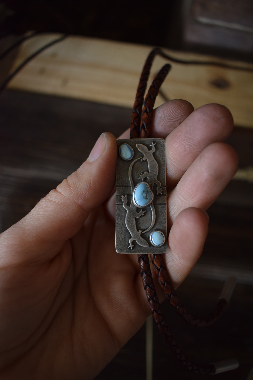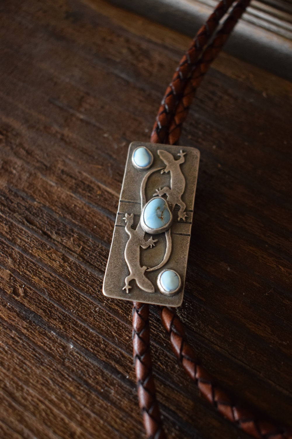 This bolo tie features two circling lizards and three Blue Gold turquoise stones on a rectangular silver backplate. About 1 3/4 inches long, it sits on a 38" braided brown cord with simple handmade tubular bolo tips and an easy double loop slide mechanism. Dipped in patina and buffed for a matte finish.