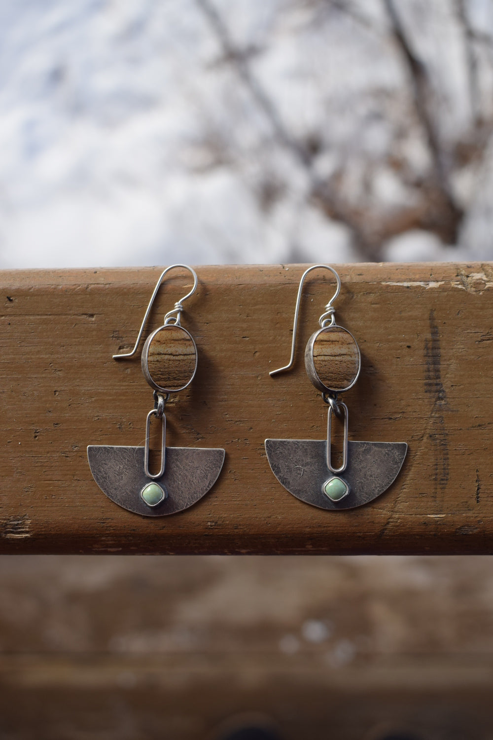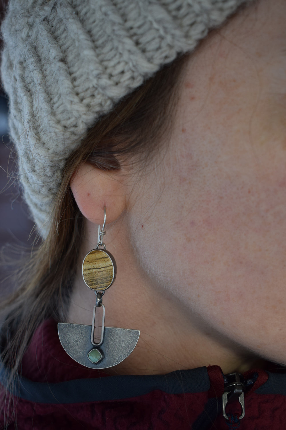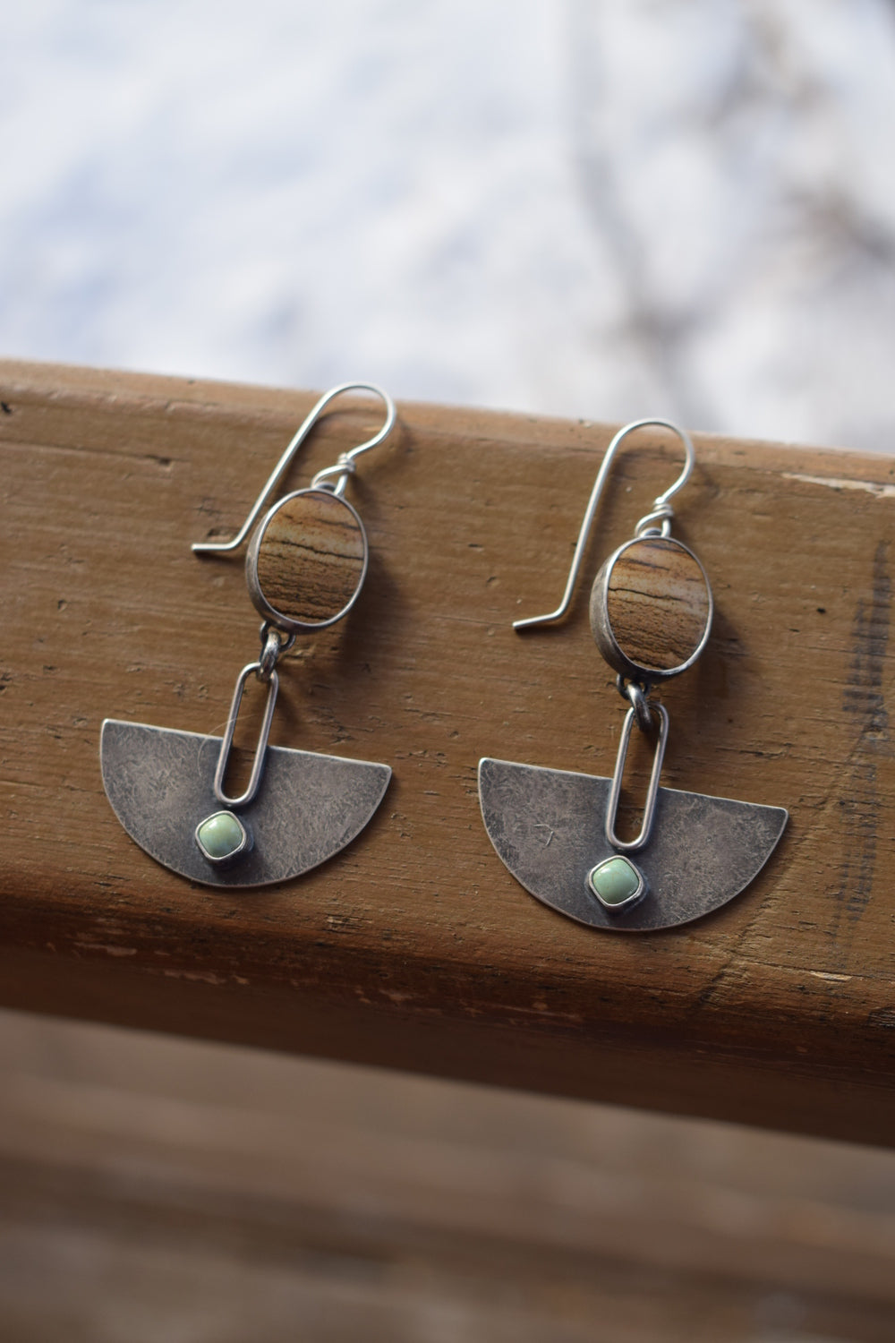Featuring gorgeous desert jasper stones with small square Lone Mountain turquoise stones on a dangling half moon. Hammered texture + added patina to bring out the detail. Handmade with care, one of a kind.