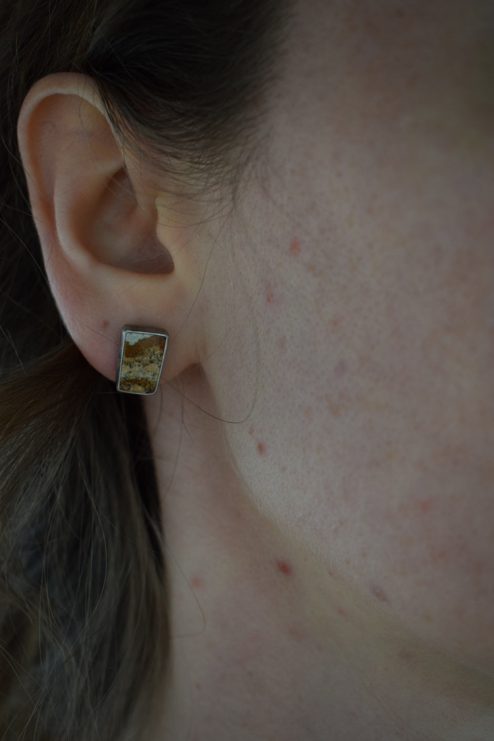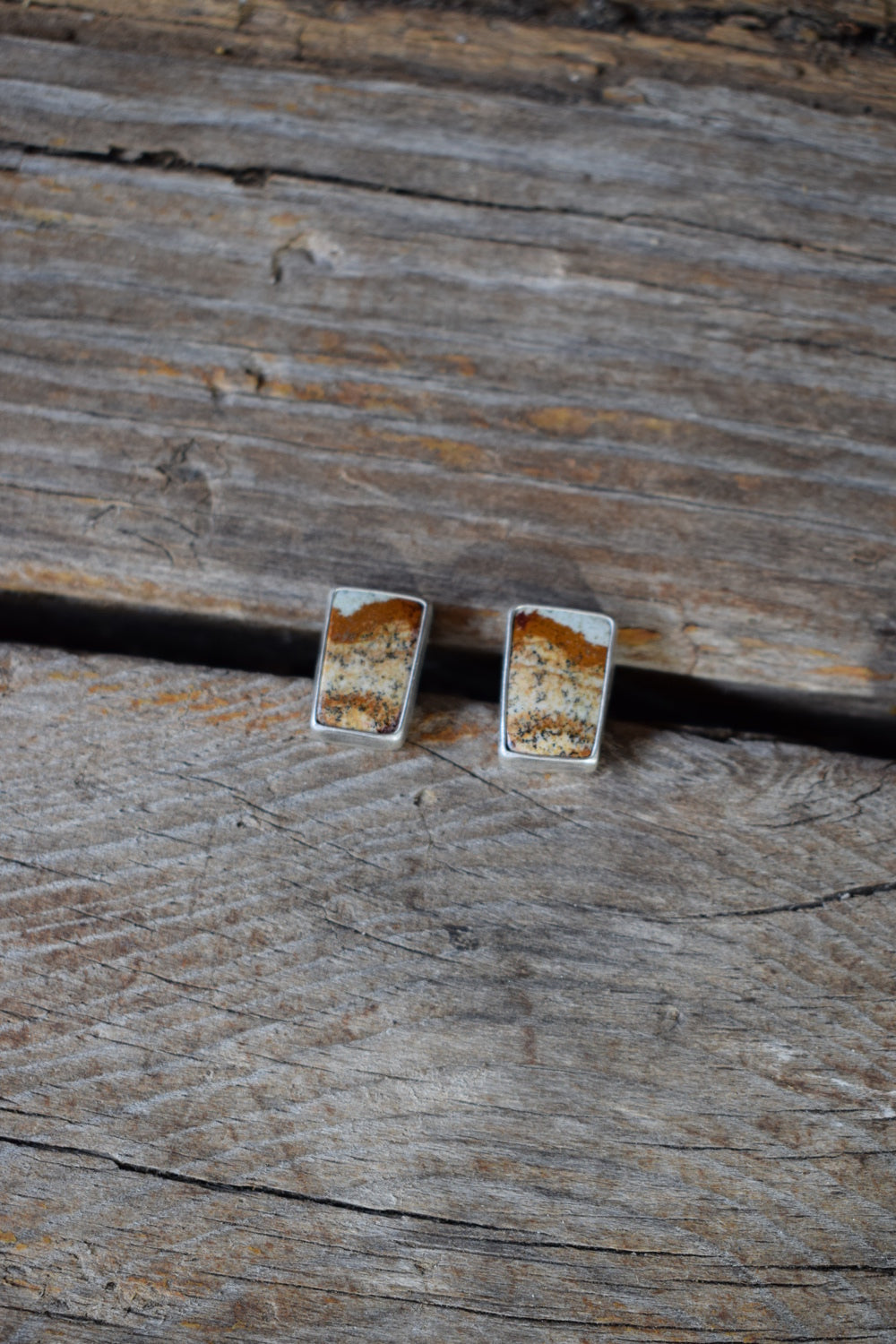 These studs feature small rectangular Desert Jasper stones in a simple setting. Sterling silver, dipped in patina and buffed for a dark, matte finish.