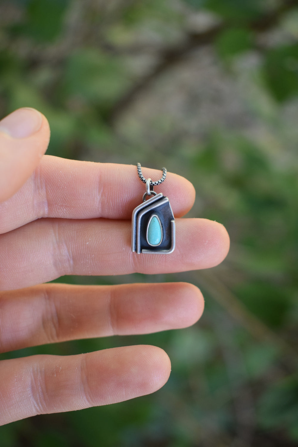 This necklace features at center a teardrop Lone mountain turquoise in angular walls. Made for home. Crafted in sterling silver, 16 inch box chain. Dipped in patina and buffed for a matte finish.