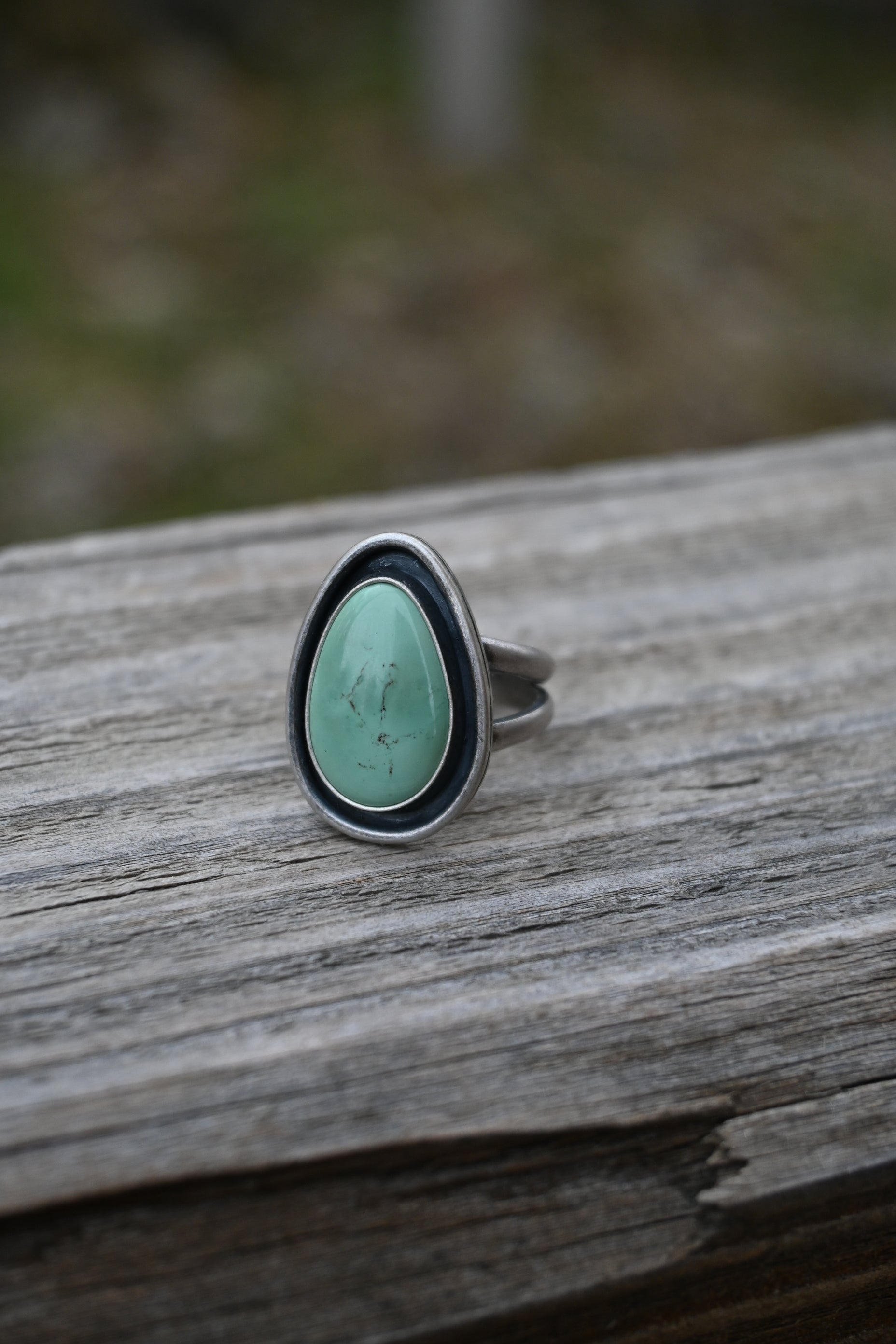 Made with sterling silver and a gorgeous Egyptian turquoise stone. Surrounded by a silver border, with a double band for comfort. Size 7.25. Dipped in patina and buffed for a matte finish.
