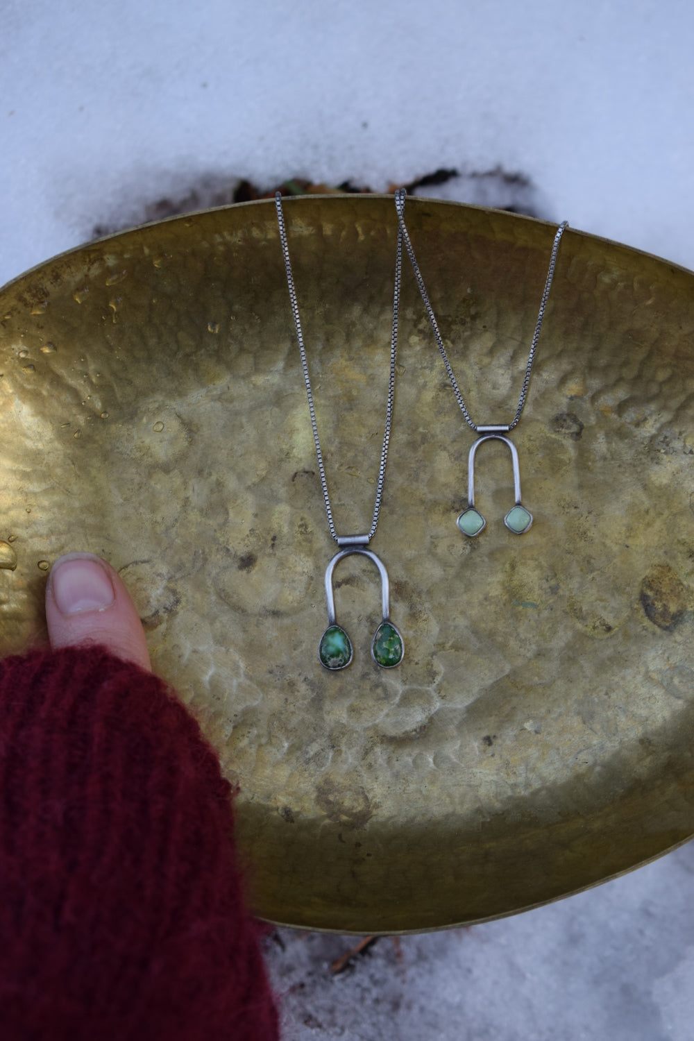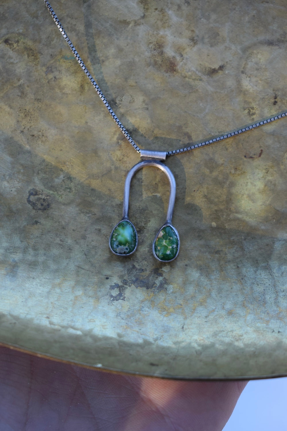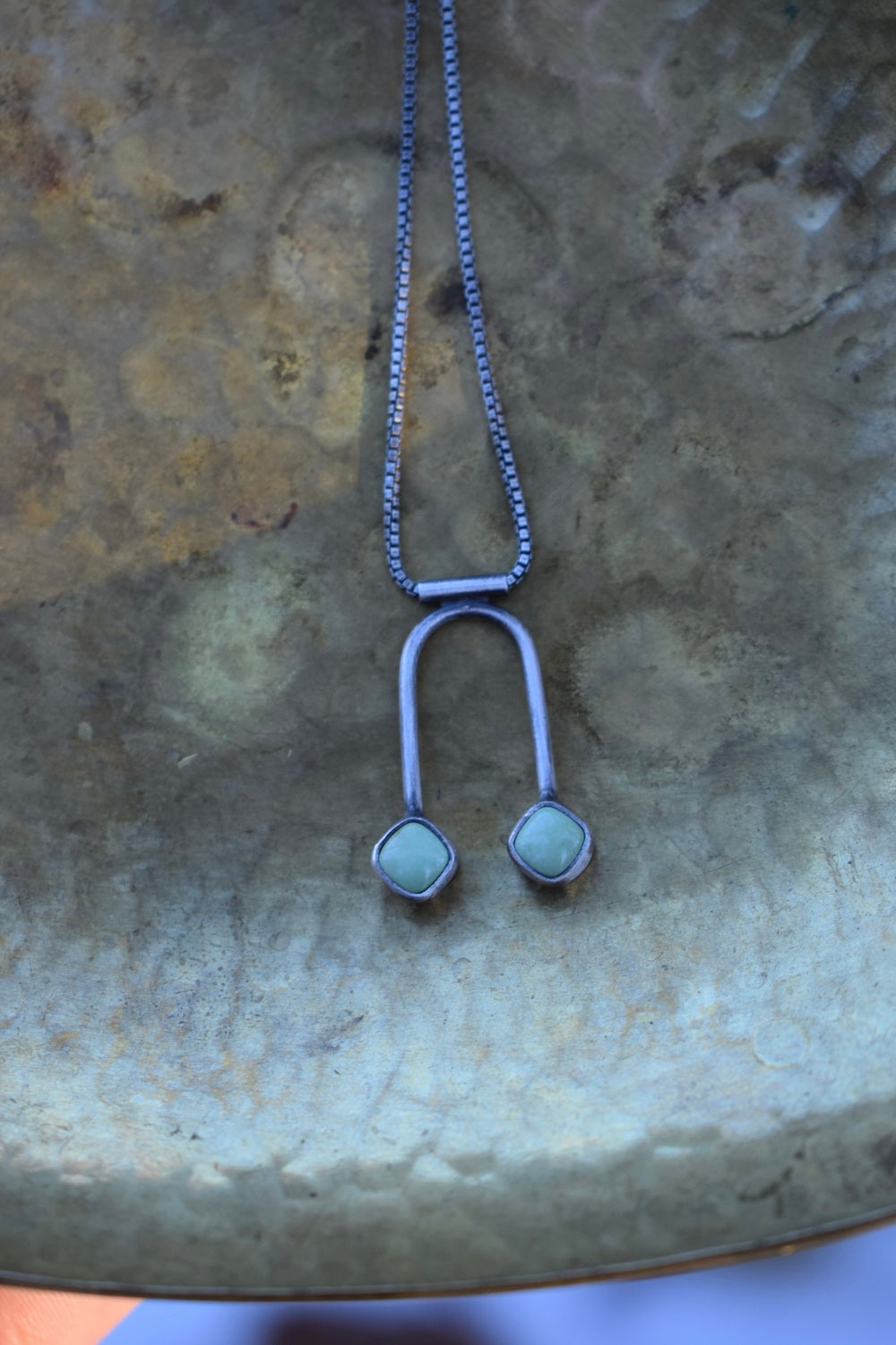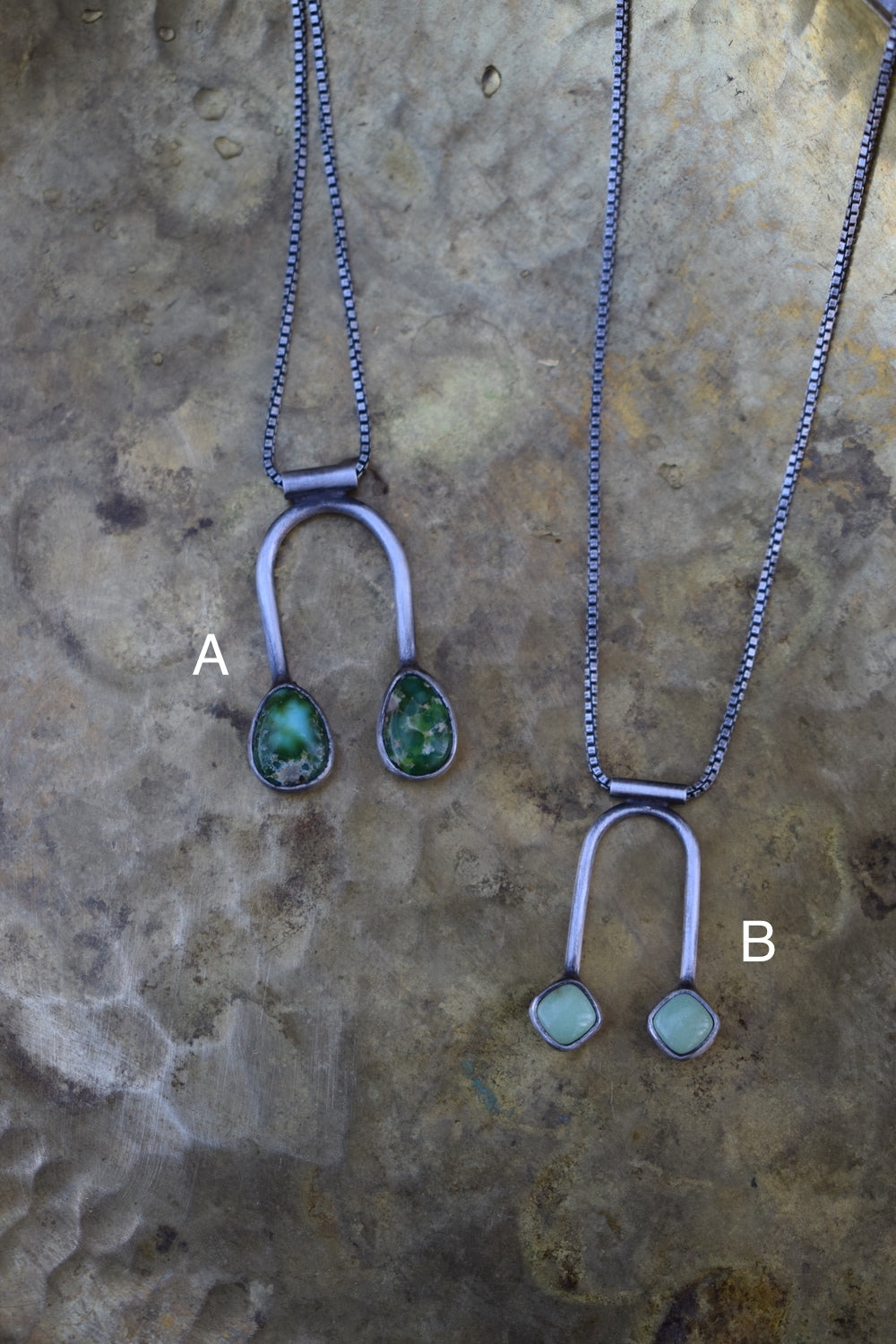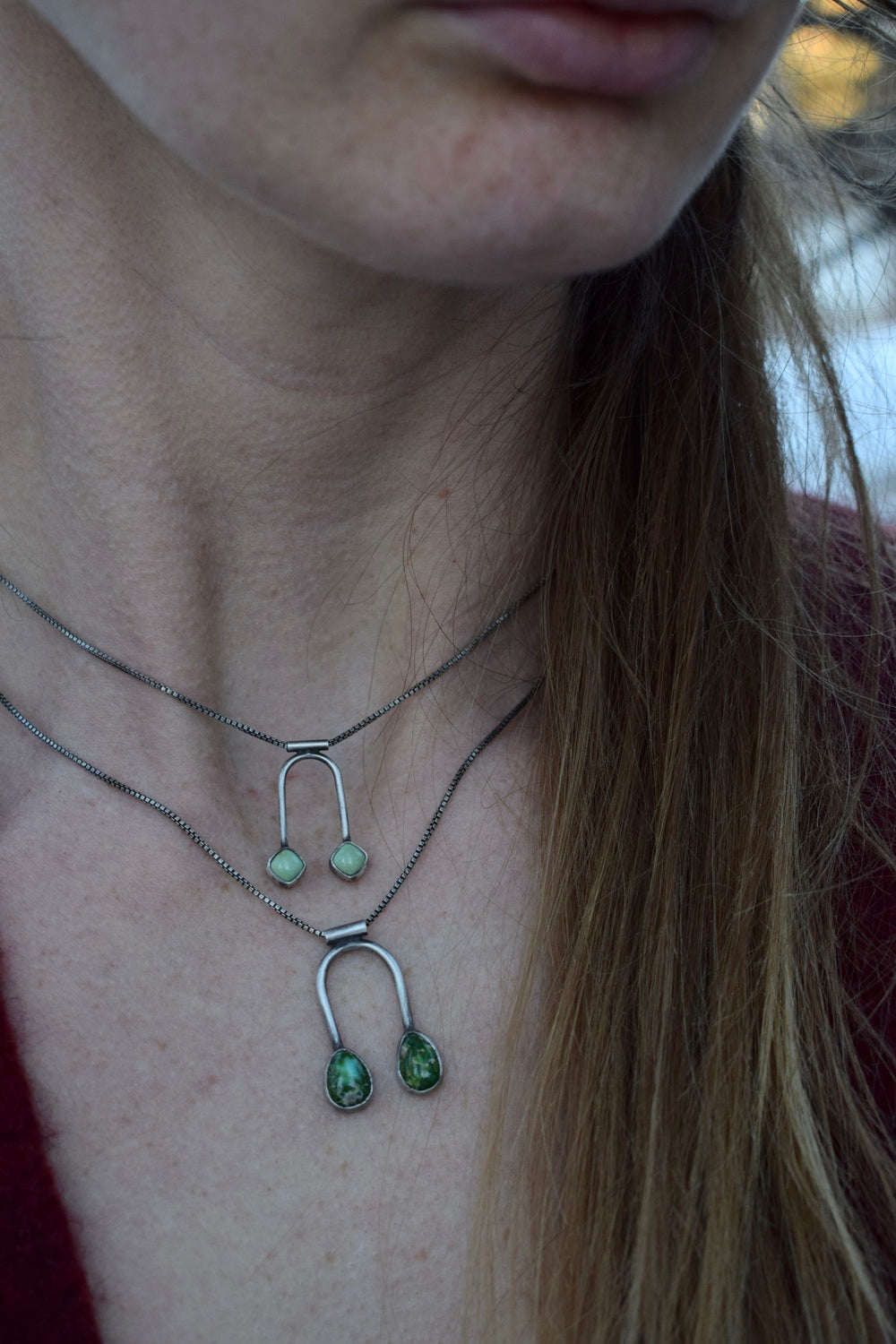 Felix A made with teardrop shape dark green Sonoran Gold turquoise, Felix B made with square light green Lone Mountain turquoise. Sterling silver horseshoe shapes with turquoise stones at the bottom, both on 14-16 inch adjustable chains. Handmade with care, one of a kind. Dipped in patina and buffed for a matte finish.