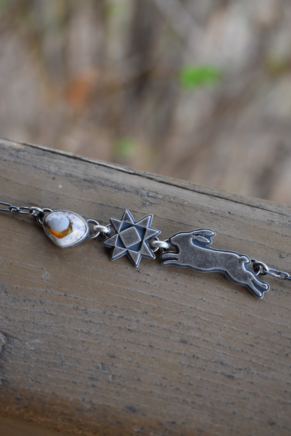 Crafted entirely in sterling silver, this necklace features a leaping rabbit, an Ohio quilt block design, and a gorgeous Mexican Cantera Opal. Crafted for fairytales and folklore, made to tell a story. Can be worn at any length up to 18.5 inches. Dipped in patina and buffed for a dark, matte finish. Handmade and one of a kind.