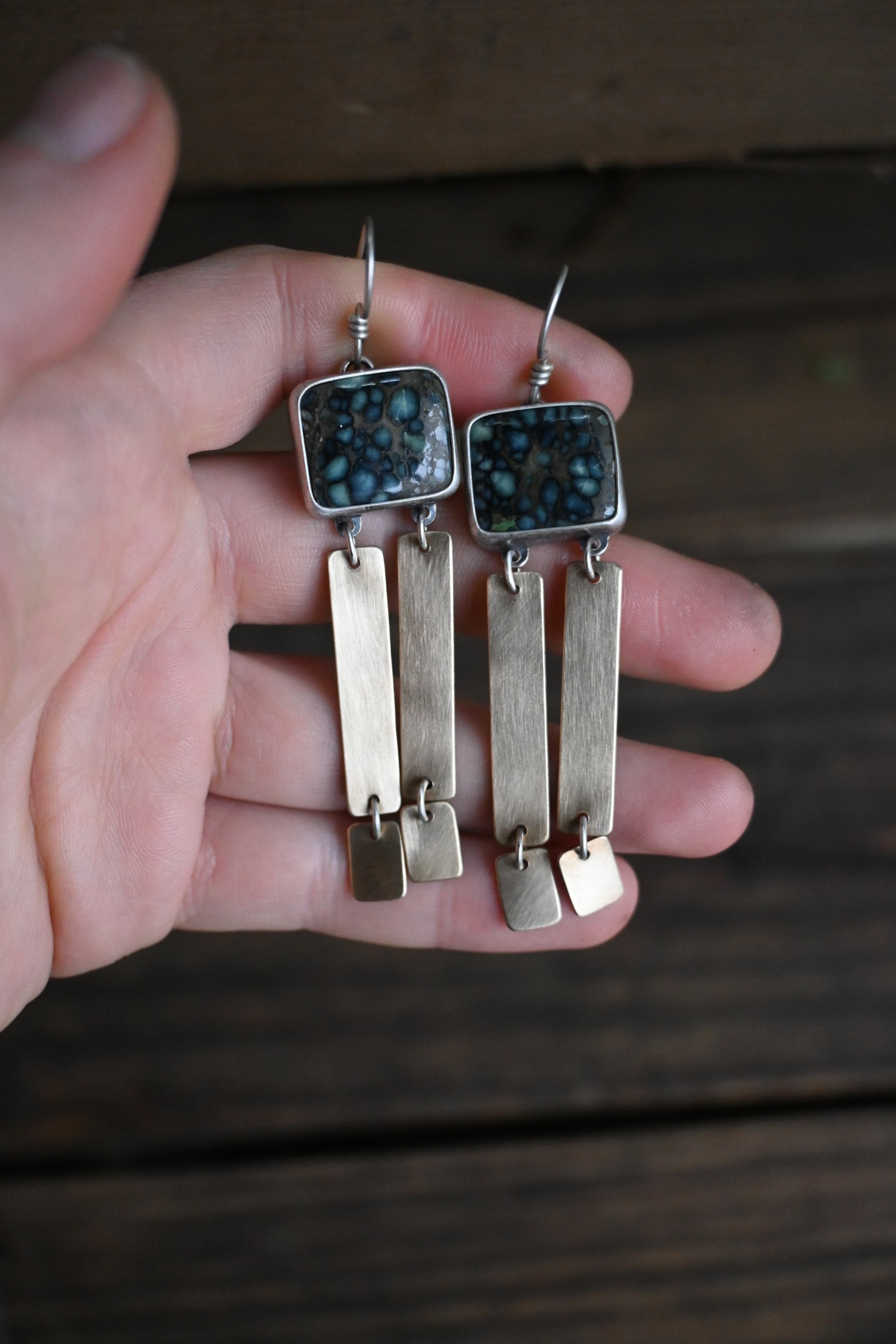 These earrings are made with gorgeous high grade New Lander Variscite stones, sterling silver, and brass. Full of movement and sound. Dipped in patina and buffed for a mixed matte silver/shiny brass finish. Measuring just over 3 inches from the top of the ear wire.