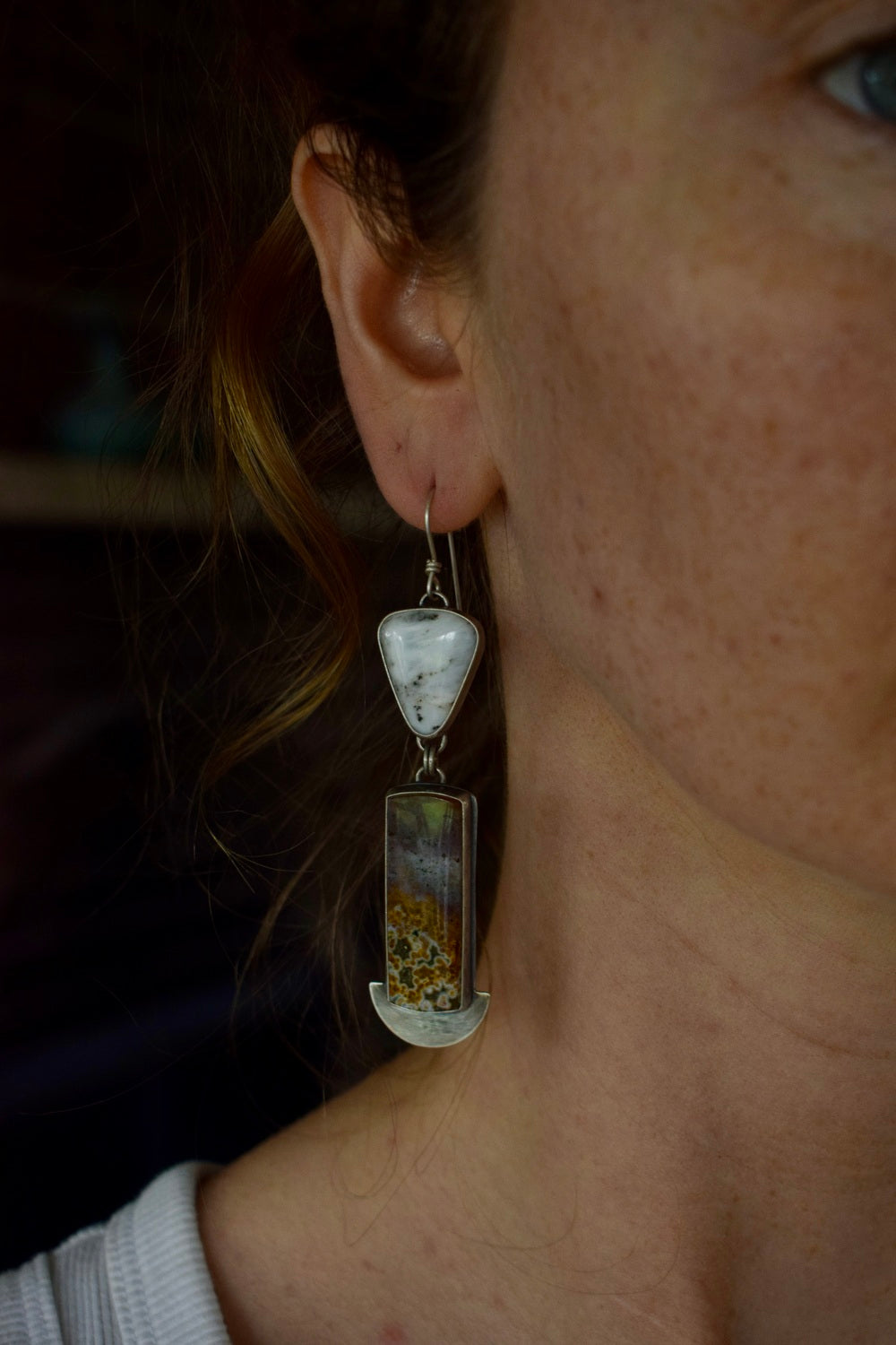 A striking pair of stones - white buffalo turquoise and river jasper stones hanging below. On the backside, two twisting snakes allow you to see the stones from both sides. Measuring 3.5 inches from the top of the ear wire, a bit on the heavier side. Dipped in patina and buffed for a matte finish. Handmade always.