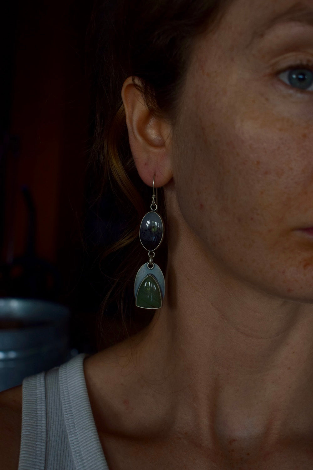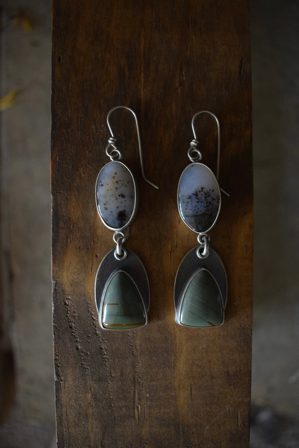 A smaller version of a past design, these earrings feature oval Montana Agates and an arched backplate with green Wild Horse Jaspers hanging below. Designed for water lilies, and beautiful aquatic growths. Delicate in design, but a statement. Dipped in patina and buffed for a matte finish. Measuring 3 inches from the top of the ear wire.