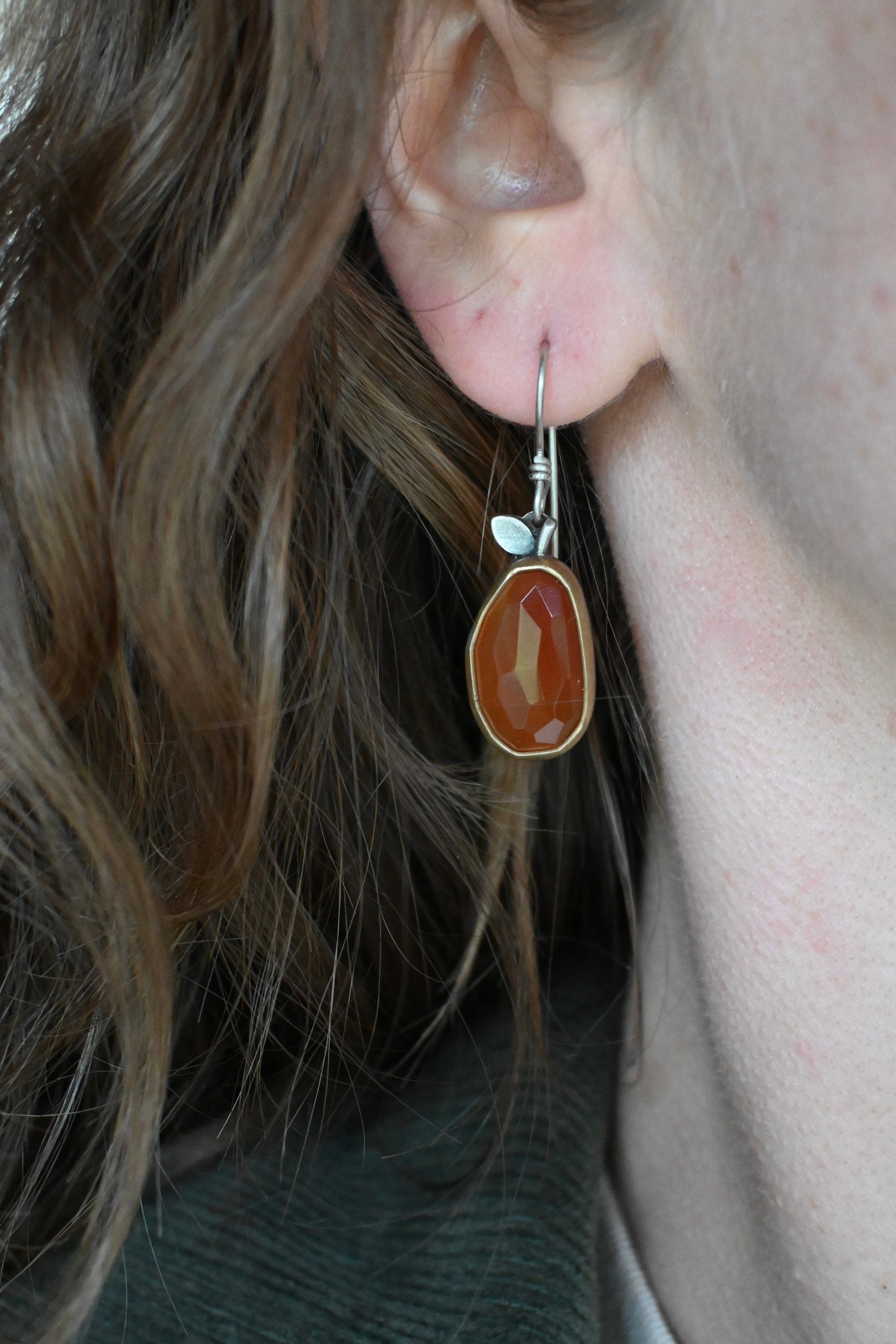 These earrings are made with mostly brass, small accents of sterling silver, and gorgeous faceted carnelian stones. Each measures 1.25 inches from the top of the ear wire and weighs 4 grams. Dipped in patina and buffed for a mixed matte/shiny finish.
