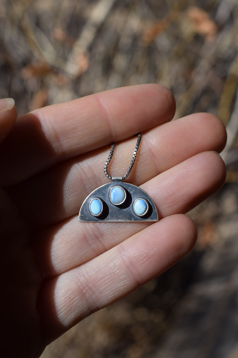 The Orion necklace features three mini Golden Hill turquoise stones on a half moon backplate. Designed after the stars. On a 16 inch box chain. Dipped in patina and barely buffed for a dark, matte finish.