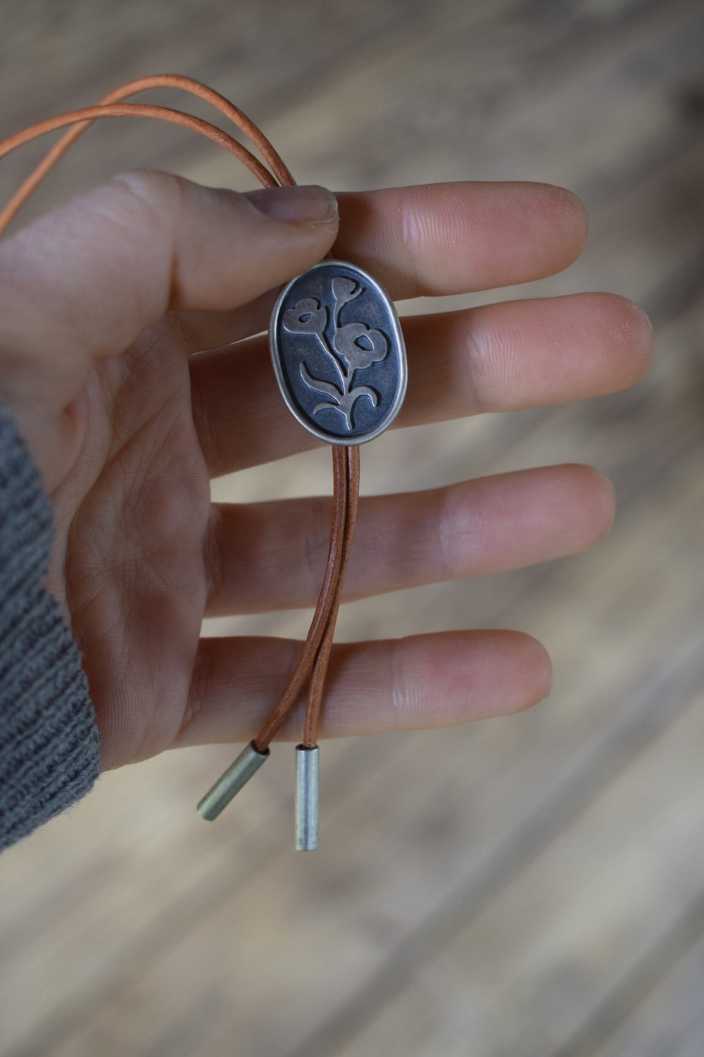 This bolo features an oval sterling silver back, border, and poppy flower. Simple handmade tips sit at the bottom of a 36" tan genuine leather cord. Silver components dipped in patina and buffed to a matte finish. One of a kind.