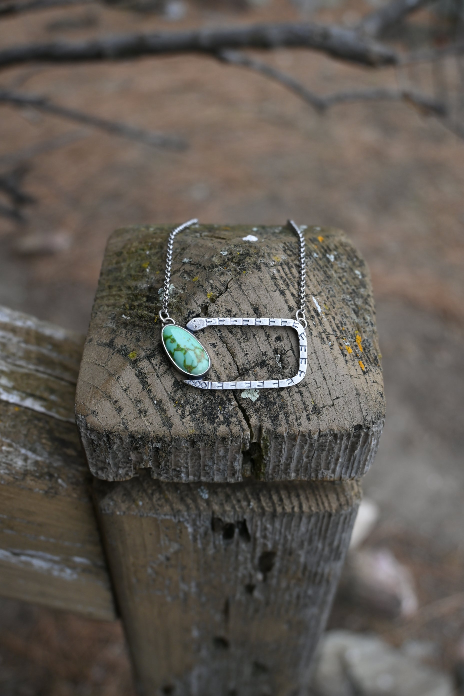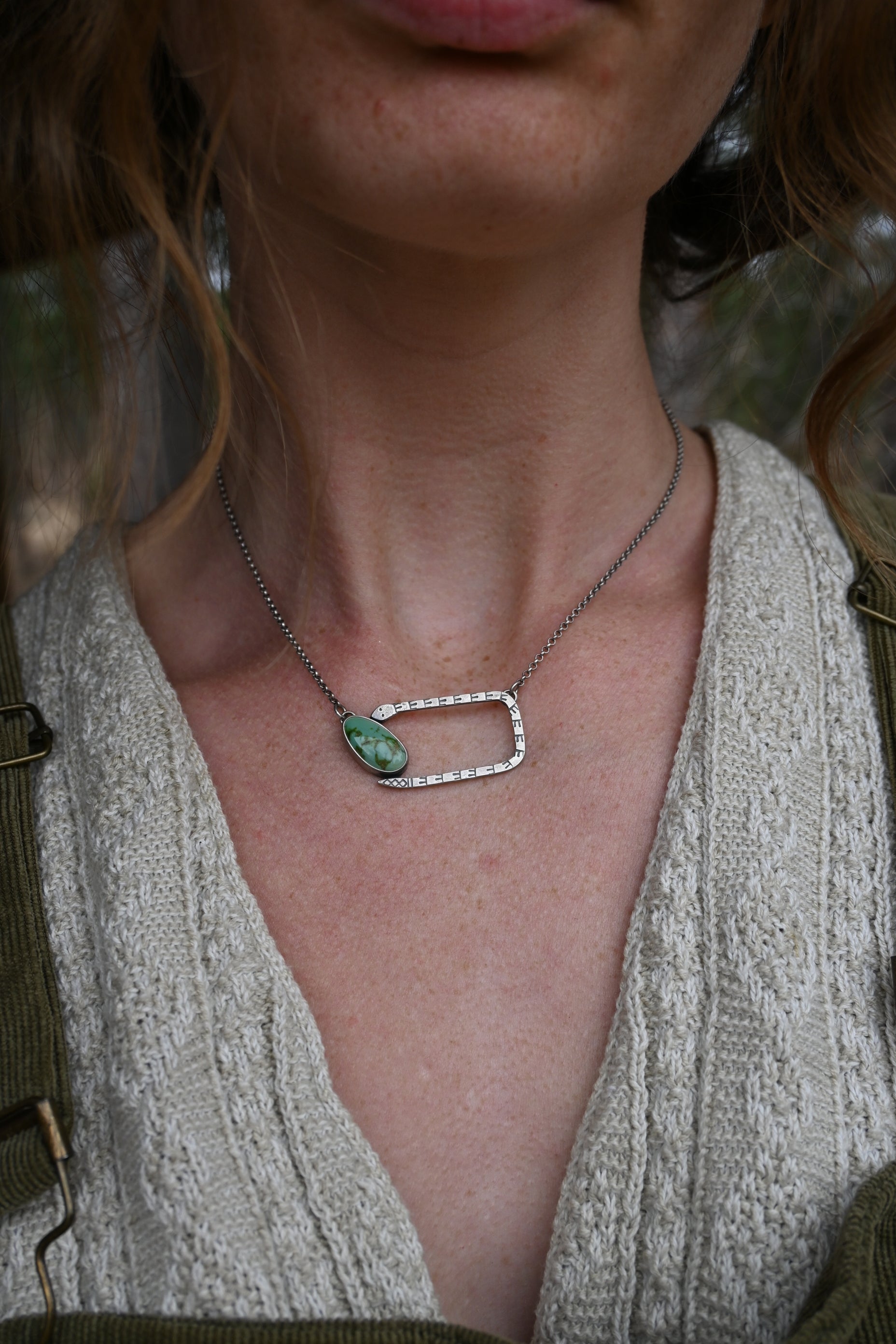 Made entirely in sterling silver, with a gorgeous Sonoran Gold turquoise and a rectangular stamped snake holding it. On a rolo chain adjustable from 15-17.25". Dipped in patina and buffed for a dark, matte finish. Handmade with care, and one of a kind.