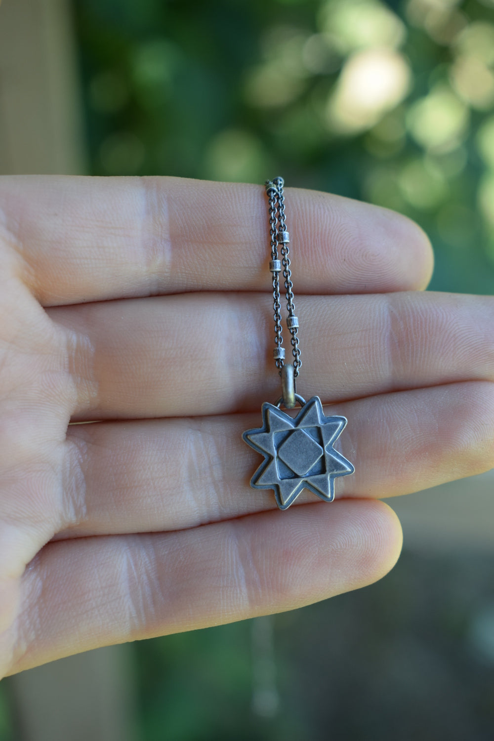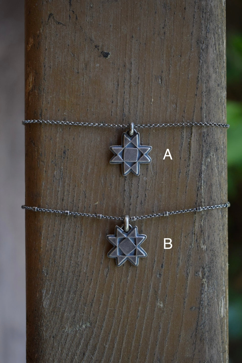 Crafted entirely in sterling silver, this necklace features an Ohio quilt block design, one in + direction, one in x direction. Made to weave a story. Dipped in patina and buffed for a dark, matte finish.