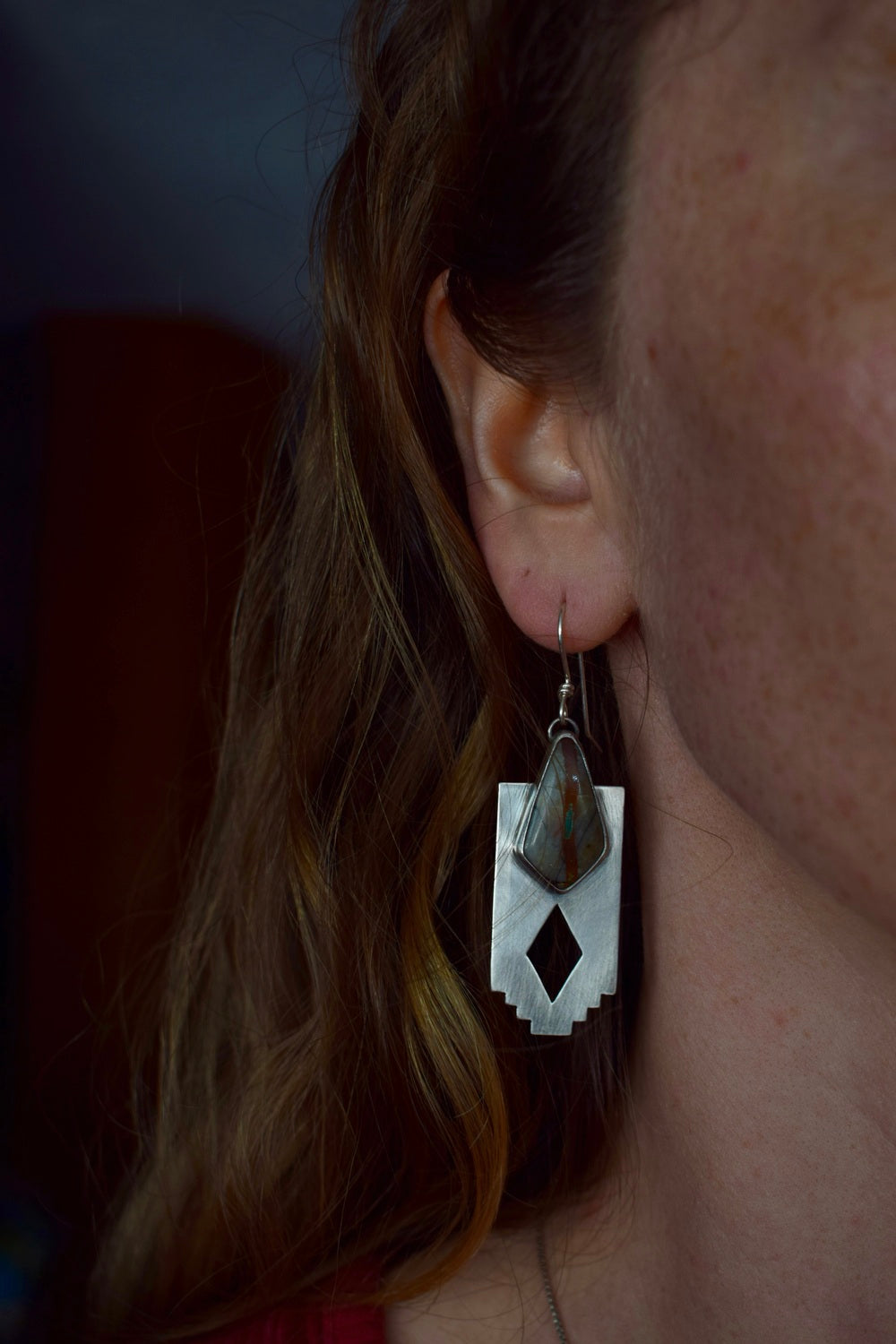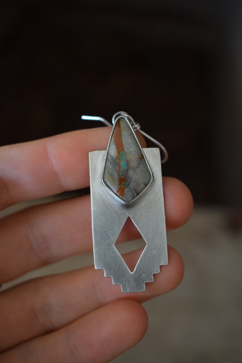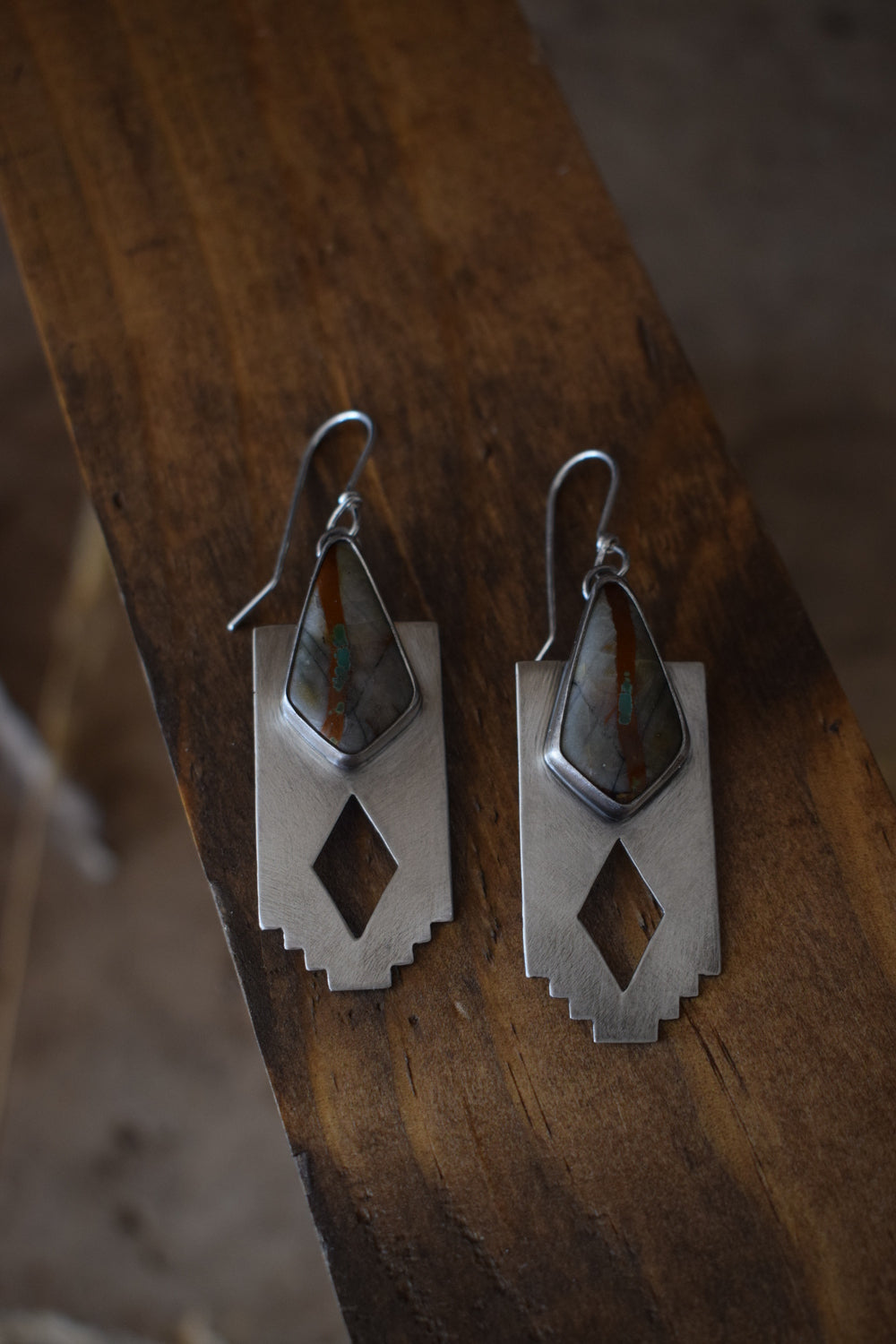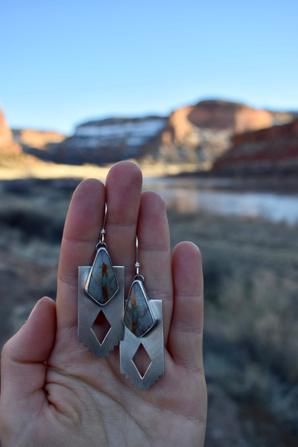 The Red Horizon earrings feature two gorgeous Royston Ribbon turquoise stones of grey, red and green. They sit on a southern edged backplate with a diamond cutout to let the light shine through. Named for southern mesa's and sunsets that dip them in gold. Added patina and hand buffed for a matte finish. Simple and sturdy, handcrafted with intention and one of a kind. Measure 2.5 inches from the top of the ear wire.
