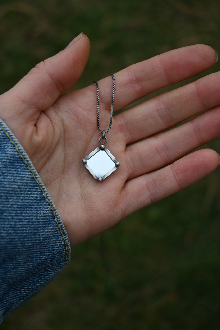 These necklaces feature sterling silver and tiny mirror for your neck. Dipped in patina and buffed for a dark, matte finish. Handmade hook clasps.