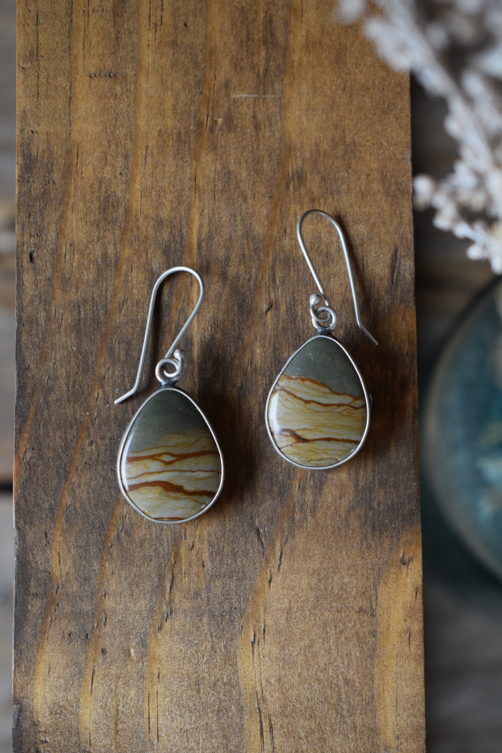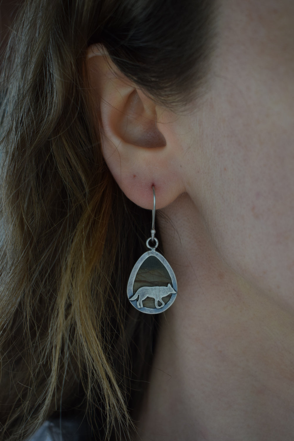 These reversible earrings feature a gorgeous and detailed pair of landscape jasper stones on a sterling silver setting. On the backside, a coyote roams and a cactus stands tall in front of the far off landscape. Simple, but with a lil kick. Dipped in patina and buffed for a matte finish. Handmade with care, one of a kind.