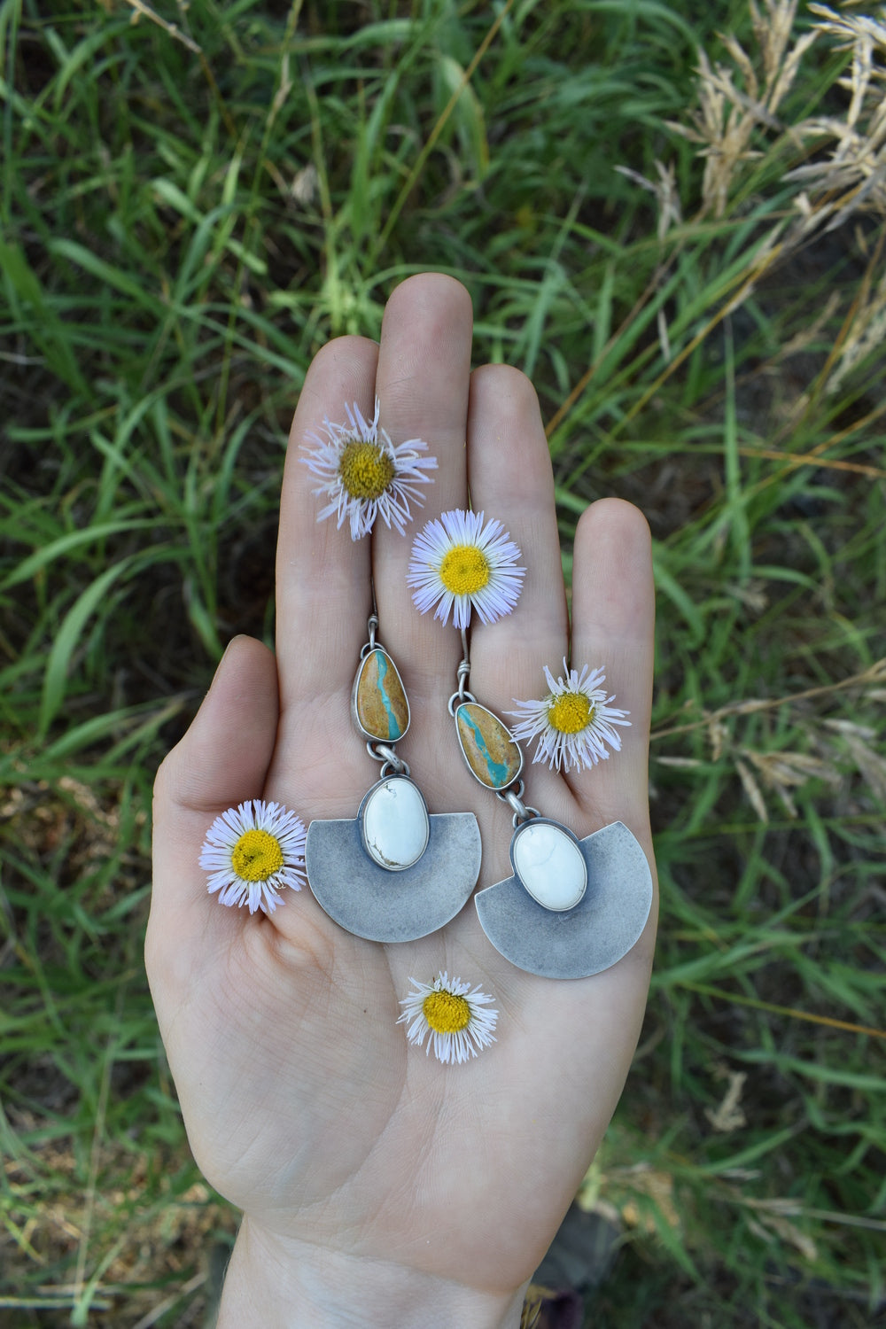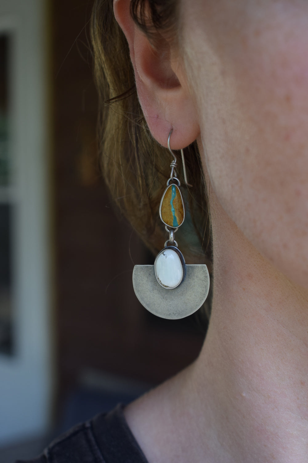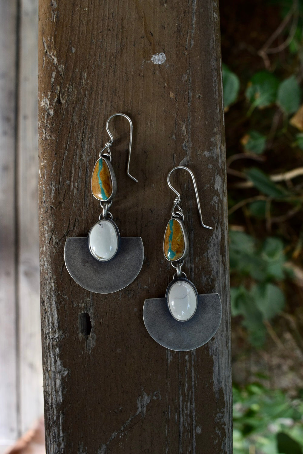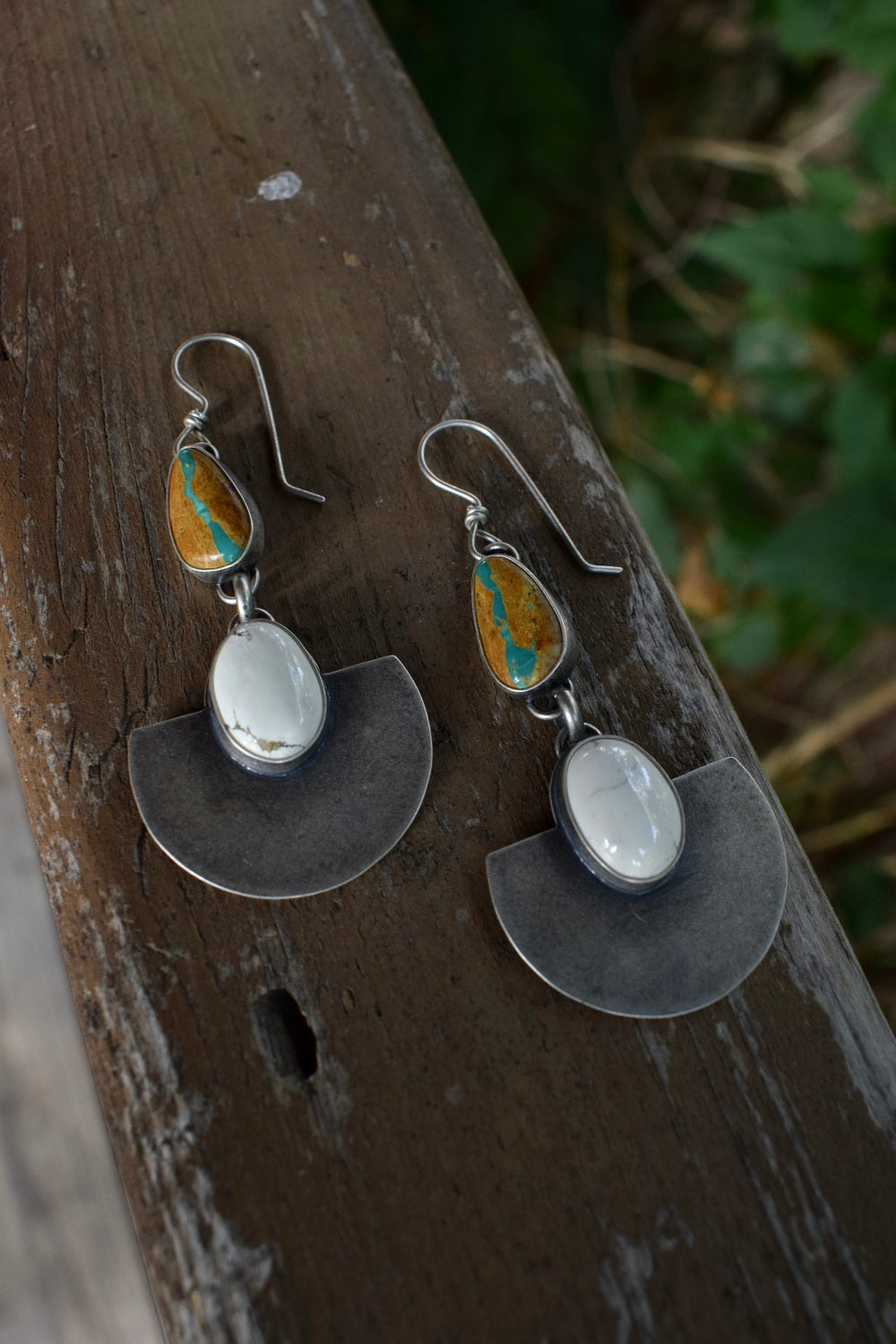 These feature bright Ivory Creek Variscite stones on a large half round backplate, hanging below gorgeous Royston Ribbon Turquoise. Set in all sterling silver. Dipped in patina and buffed for a dark, matte finish. Measuring 2.75 inches from the top of the ear wire.