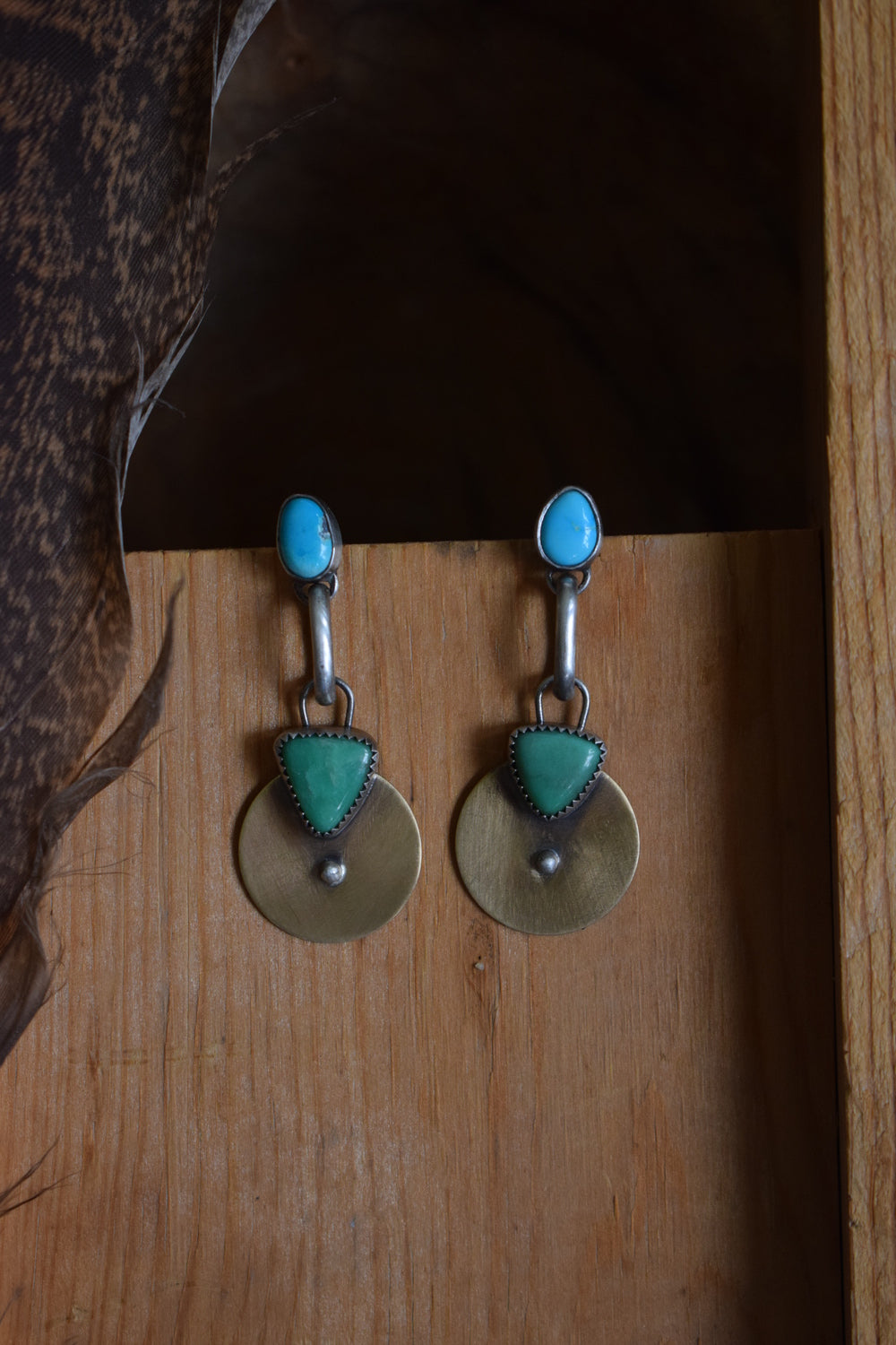 The Shield Earrings were designed for historical pieces of armor. As symbols of protection. Blue Sonoran turquoise studs hold a long oval chainmail style silver wire, which holds a circular brass backplate with a bright green Utah Variscite. Very lightweight, handmade with care, one of a kind.