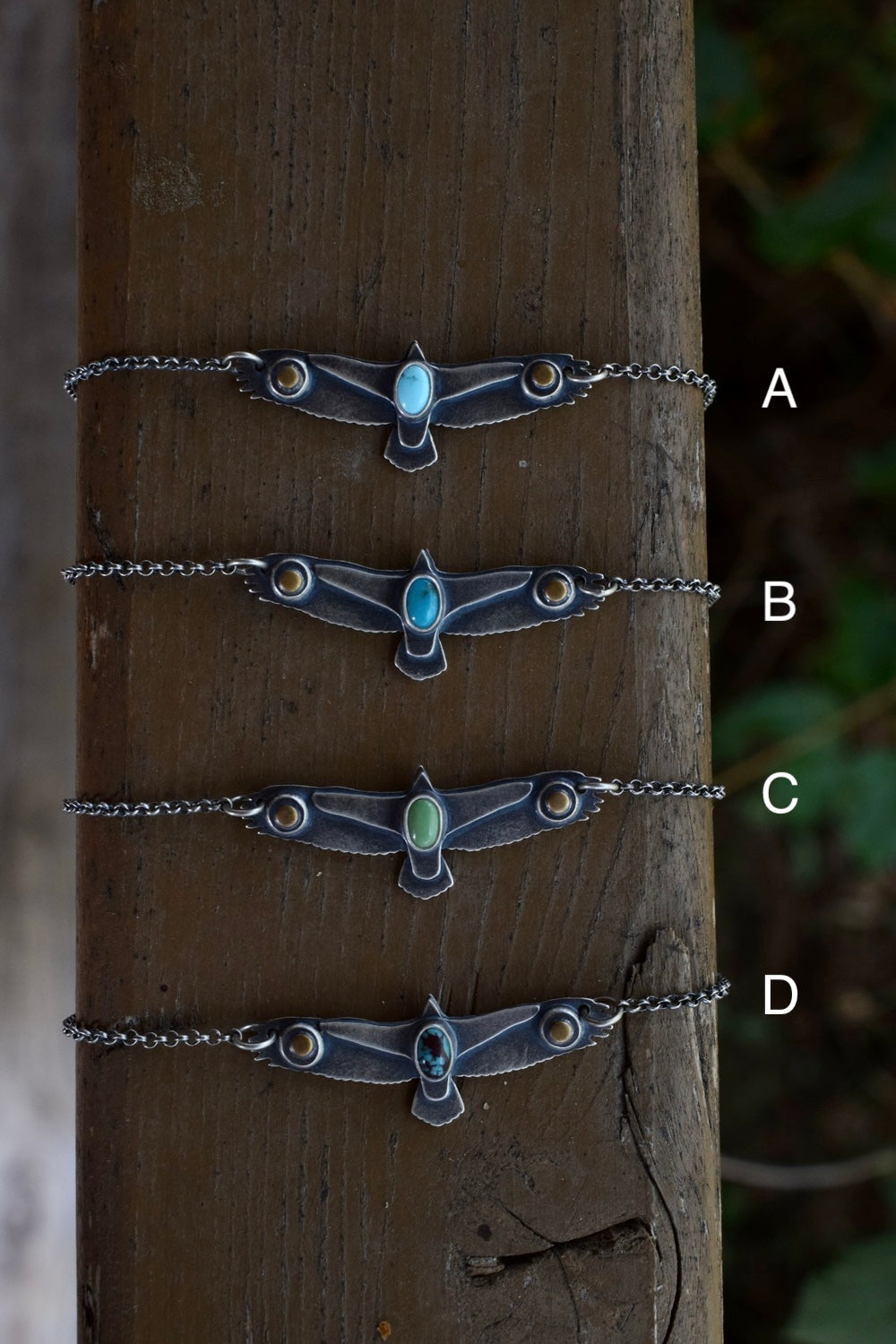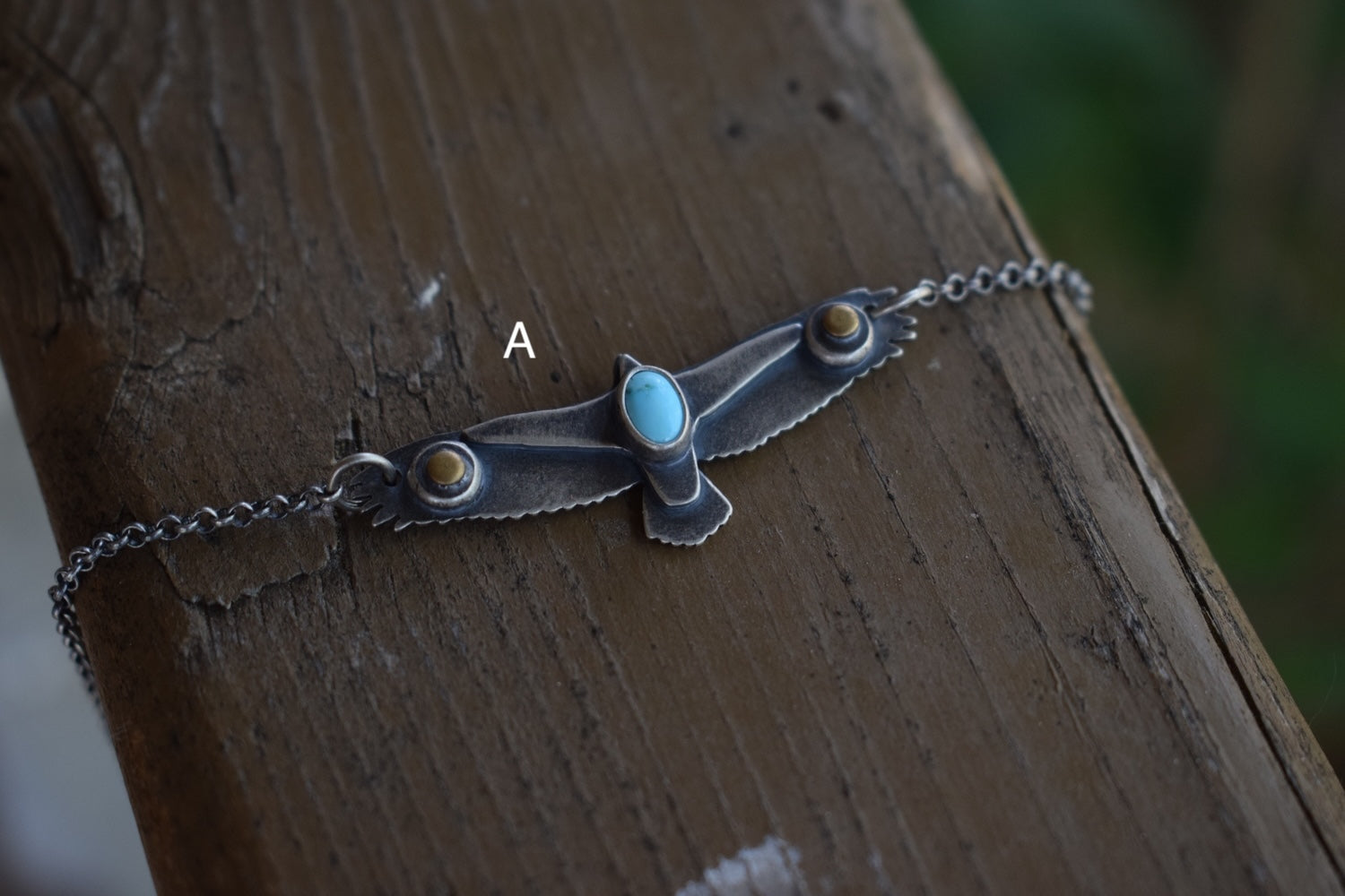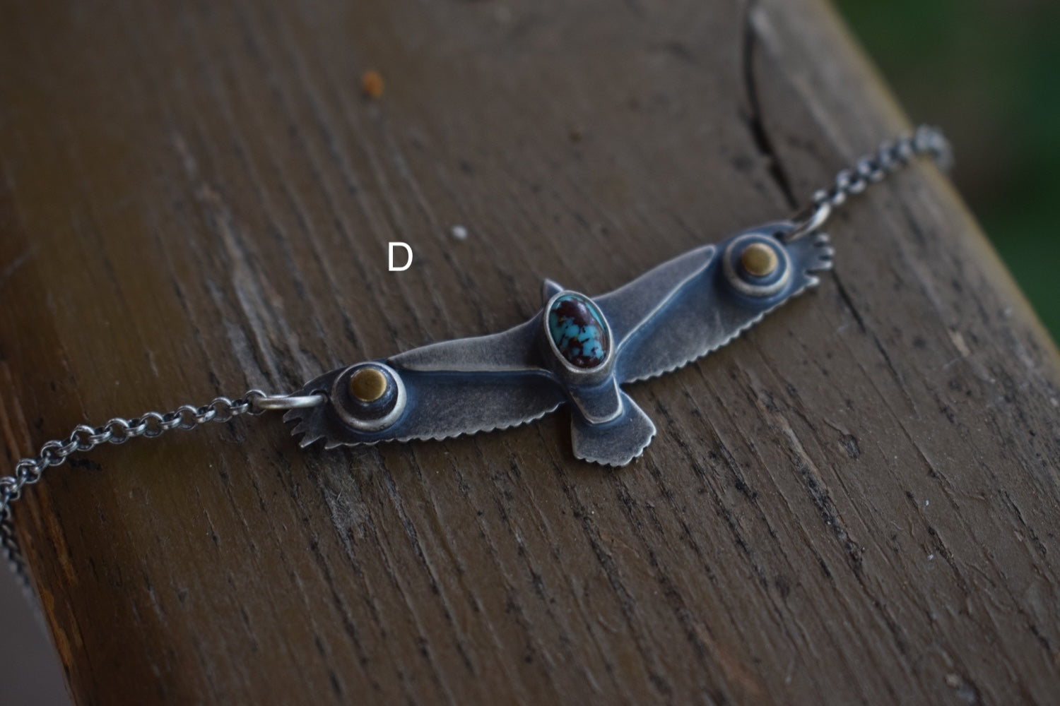 An eagle in flight, with a Mexican Turquoise (A,B,C,D) center and circular silver and brass accents. A-light turquoise, B-dark turquoise, C-light green turquoise, D-blue+black turquoise.