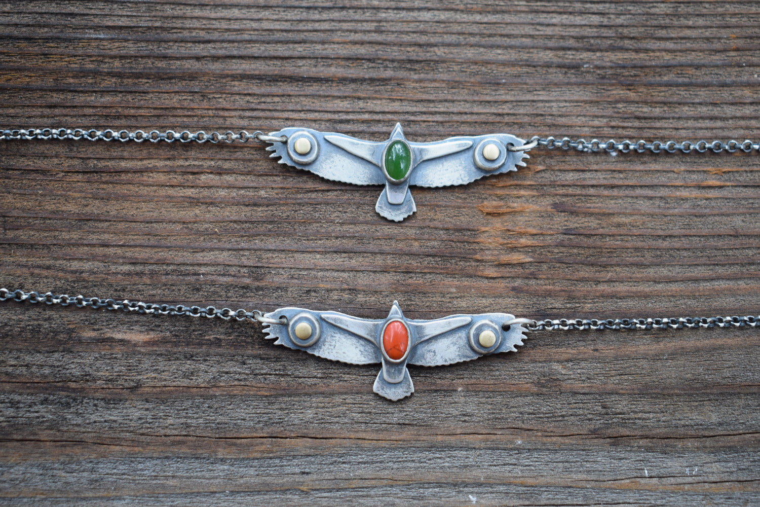 MADE TO ORDER - please allow 2-3 weeks for shipment. An eagle in flight, with either a Nephrite Jade or Red Jasper center and circular silver and brass accents.