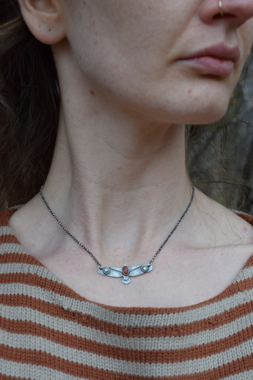Hand textured to mimic the rugged life of the bird, with patina to bring out the details. On a 15 inch sturdy chain, that can be adjusted up to 17 inches. To remind you to soar, to ascend, to keep moving upward when you can. Handmade slowly with care, one of a kind.