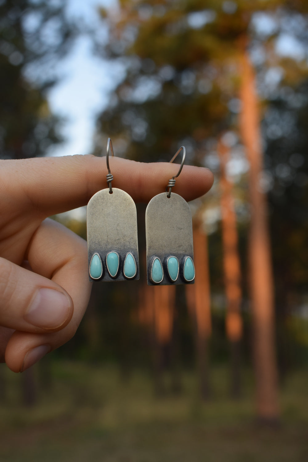 Three reversing Lone Mountain Turquoise sit at the bottom of each arched earring. Set in all sterling silver, dipped in patina and buffed for a matte finish. Crafted slowly and one of a kind. Measure just under 2 inches from the top of the ear wire.
