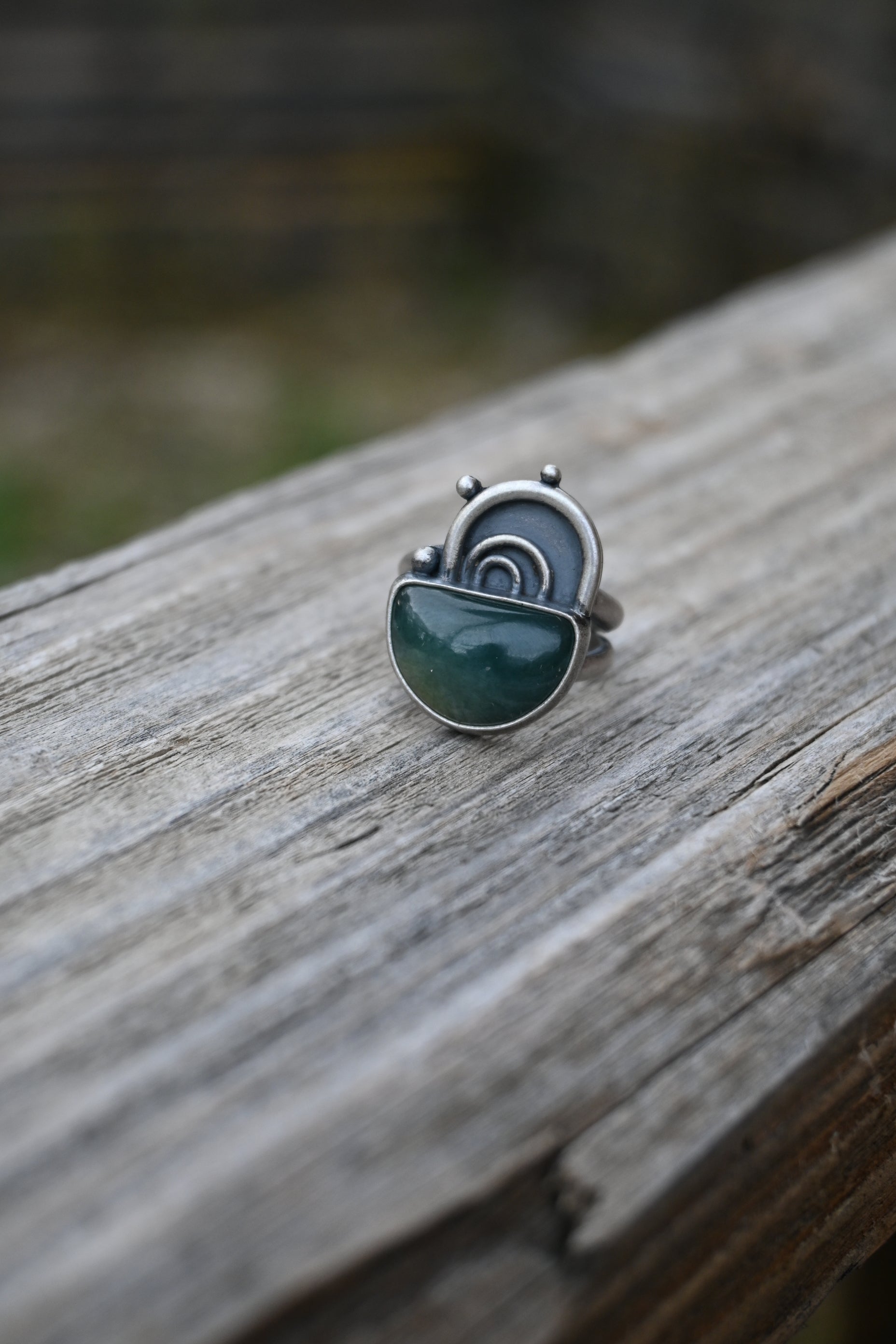Made with sterling silver and a gorgeous Guatemalan jadeite half round stone. Surrounded by half circle accents, with a double band for comfort. Size 5.5. Dipped in patina and buffed for a matte finish.