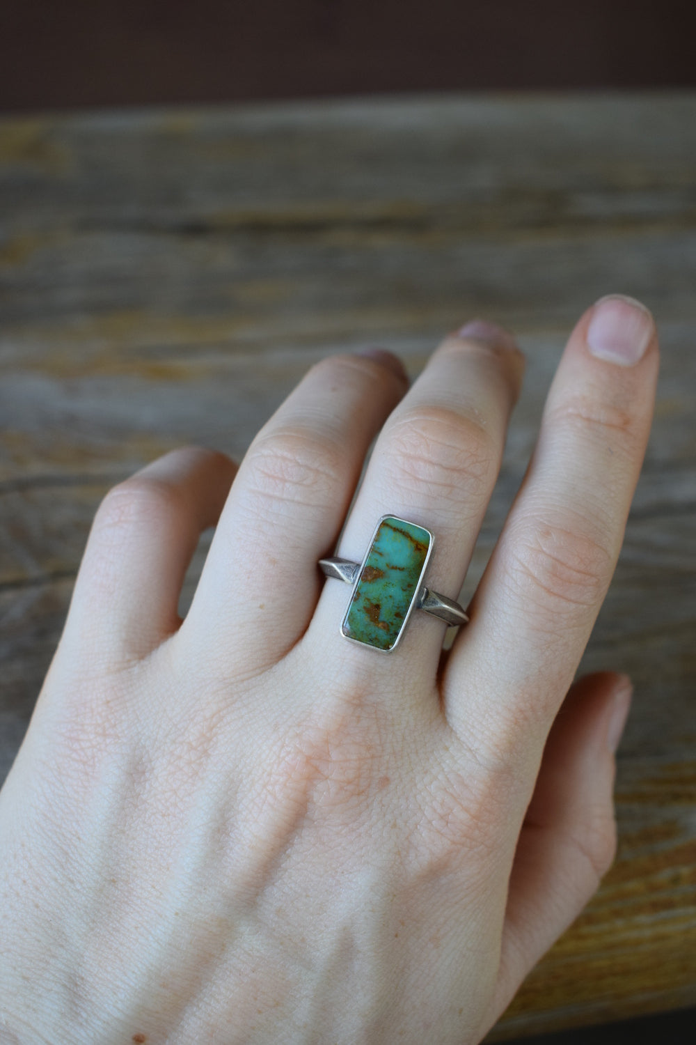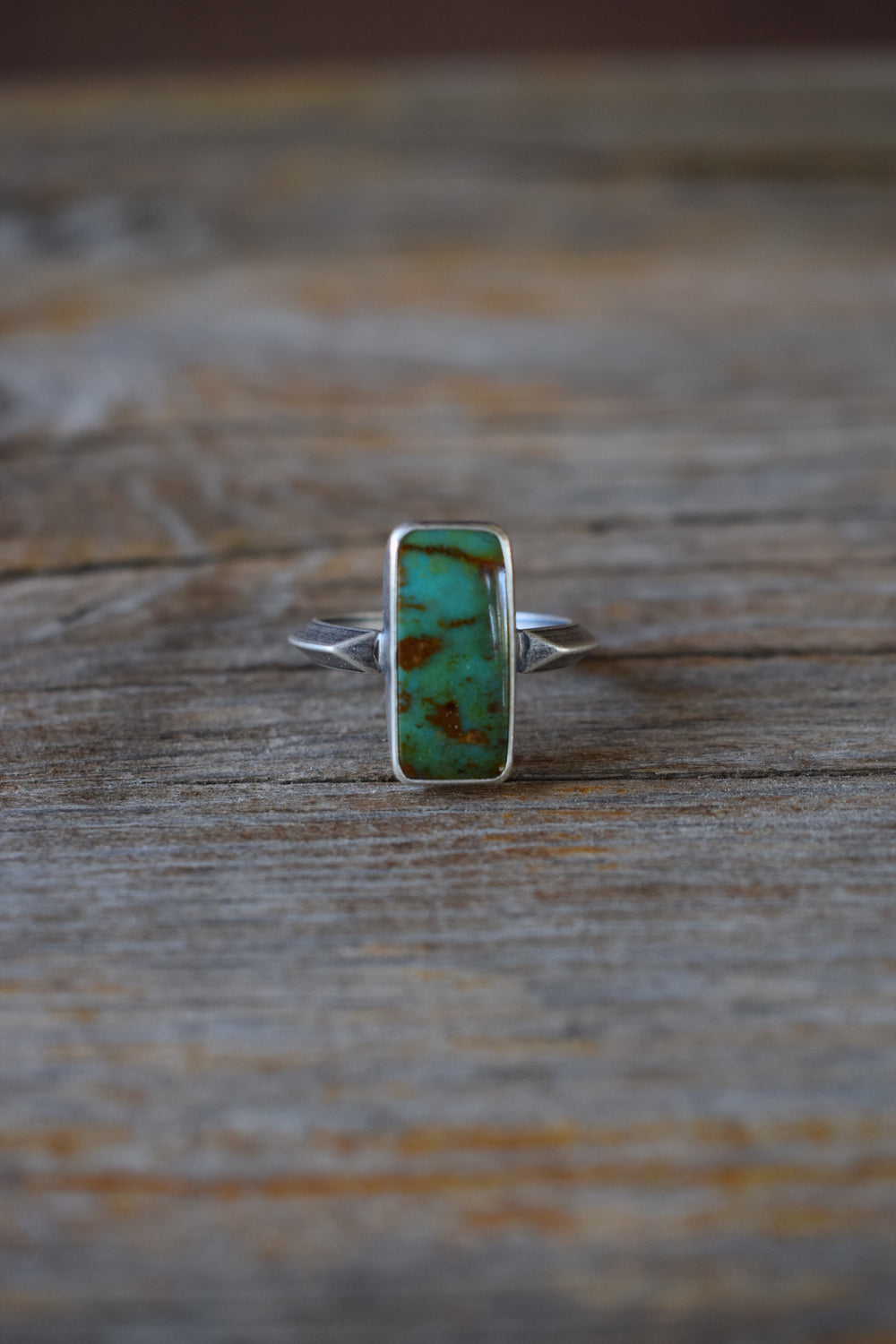 A beautiful Sonoran turquoise sits surrounded by a triangle wire band. Set in all sterling silver. Size 8.5, dipped in patina and buffed for a matte finish.